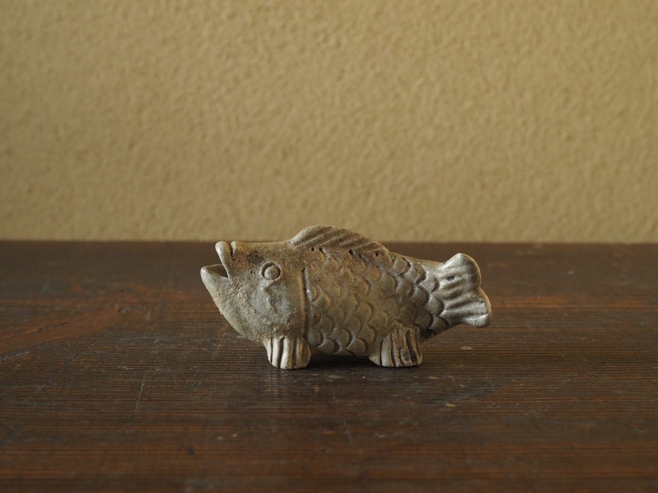 可愛らしい魚形の美濃御深井釉水滴です。釉薬のカセはありますが、