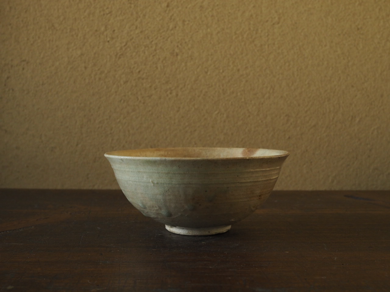やわらかな白磁肌に滴り落ちる淡青色の釉溜まりに目が留まります。小さめの高台に懐の深い