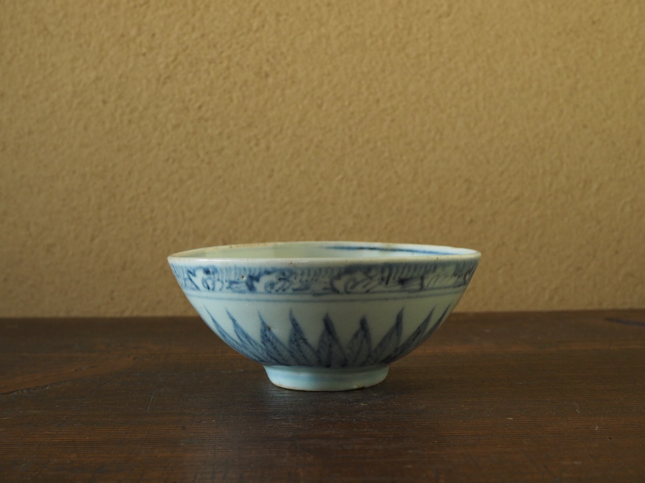 中国南方系の染付碗で、手頃な寸法に清潔な磁肌と腰の周りに巡らされた葉文様がいかにも