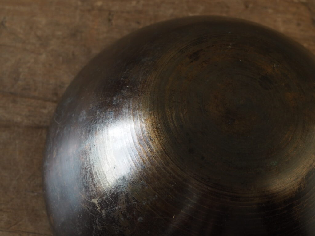 やや厚めの響銅(砂張)製で仏具の鈴(りん)として伝わったと思われ、その名の通り叩きますと