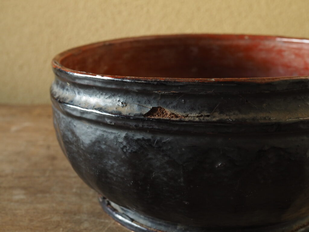 元来はビルマの寺院に奉納された供物容器であったようです。竹を編んで本体を作り漆をかける