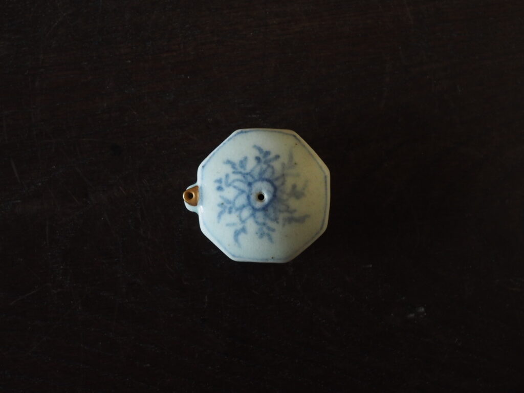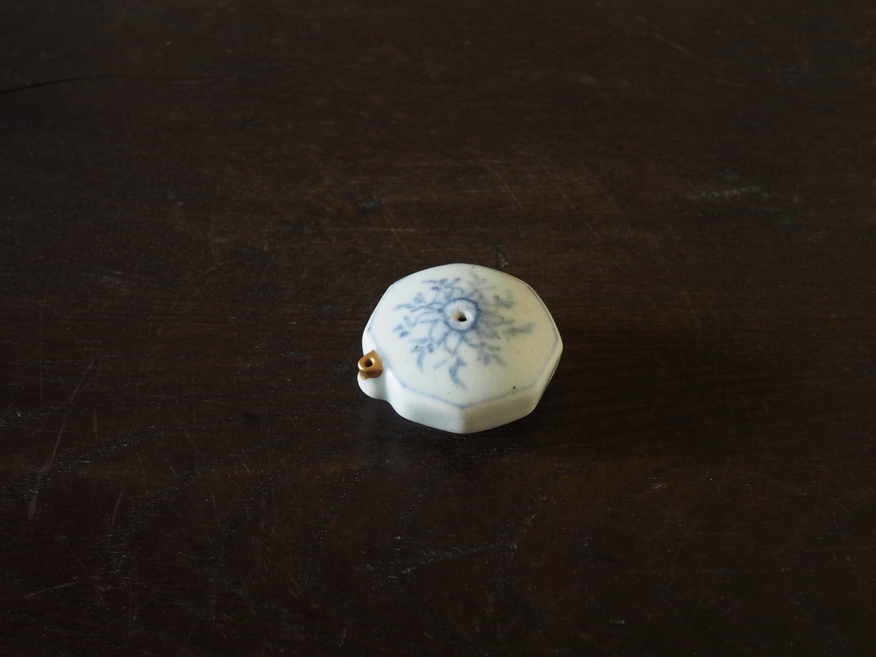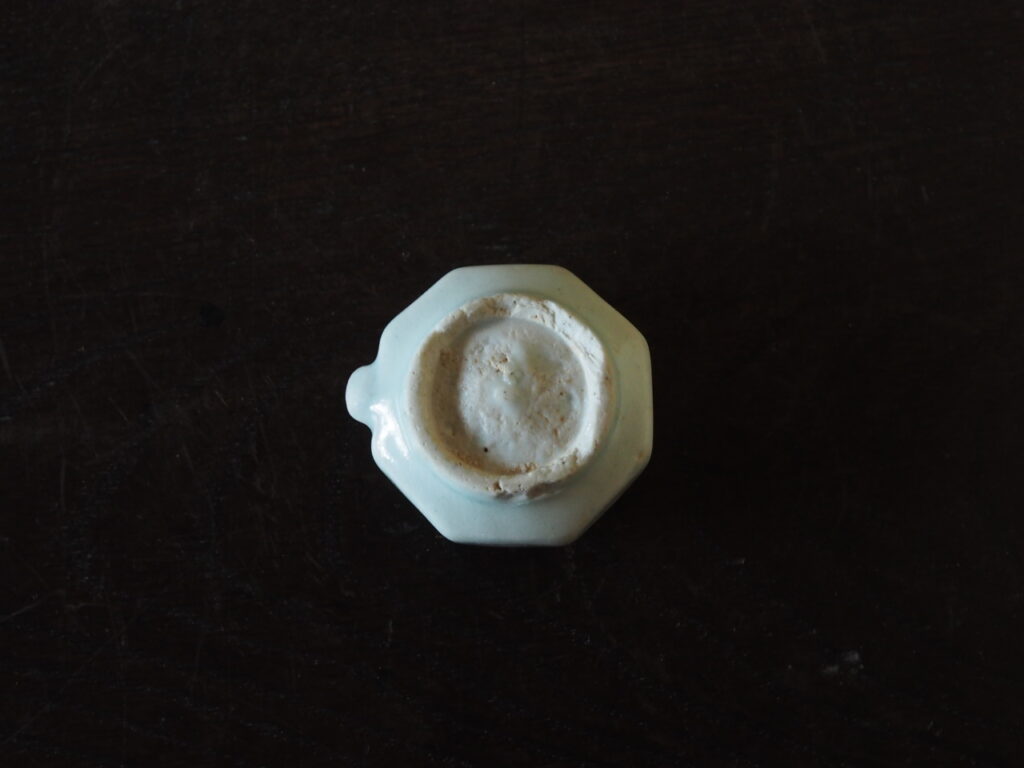 八角面取を施した小粒の水滴で、明るく瑞々しい分院の肌が眩しく、淡い染付で描かれた薔薇の花が