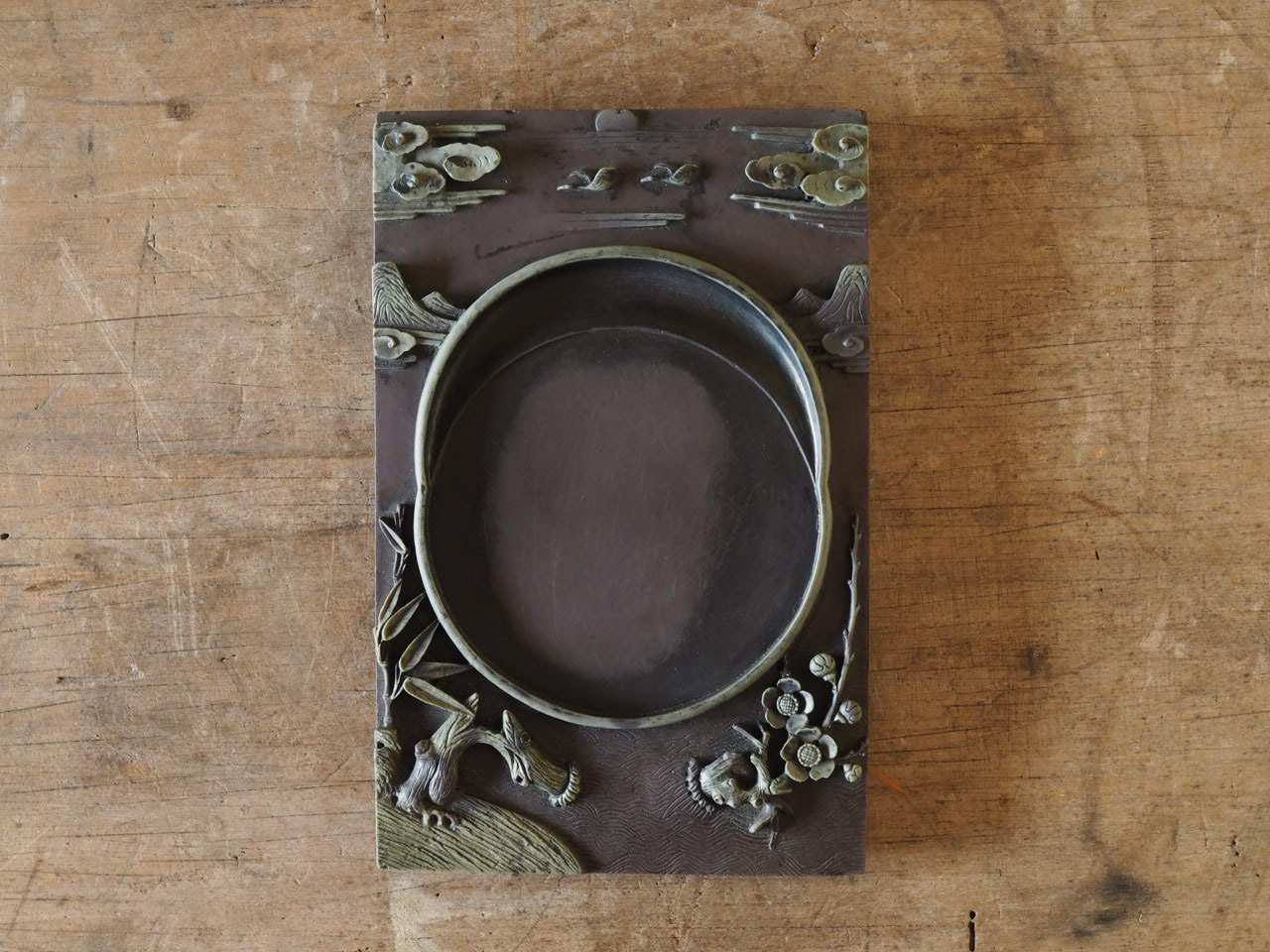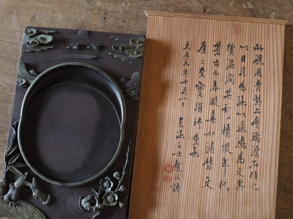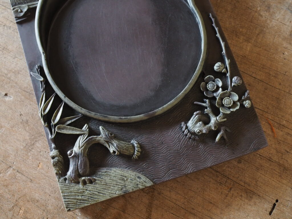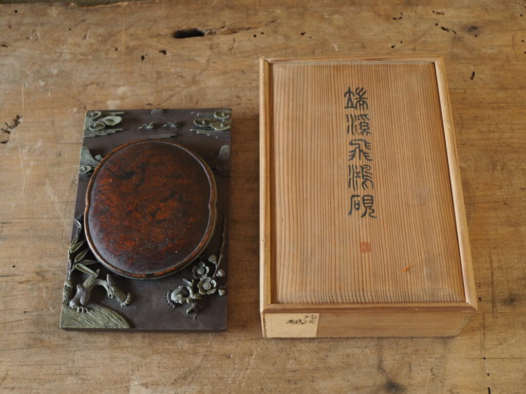 朝鮮半島北部で産出される暗紫色と淡緑色の二層になった渭原石の硯で、「渭原端渓」とも
