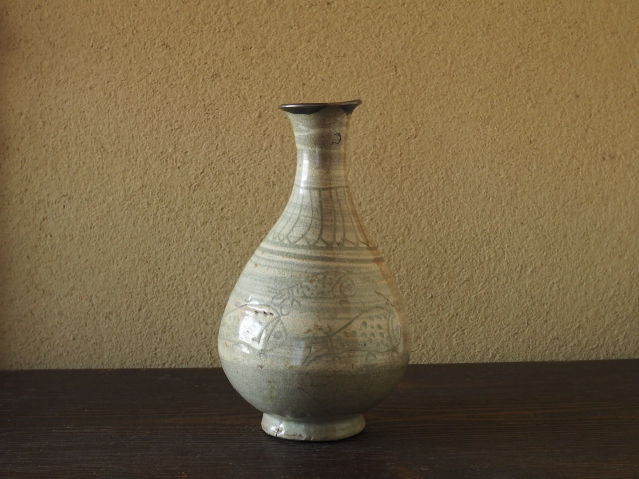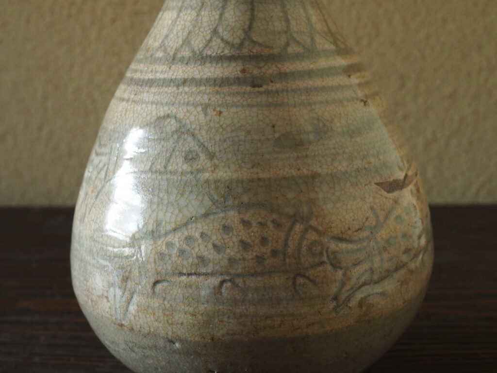 なんと大らかなやきものでありましょうか。5匹の魚と柳の木が稚拙ではありますが、強くて慣れた