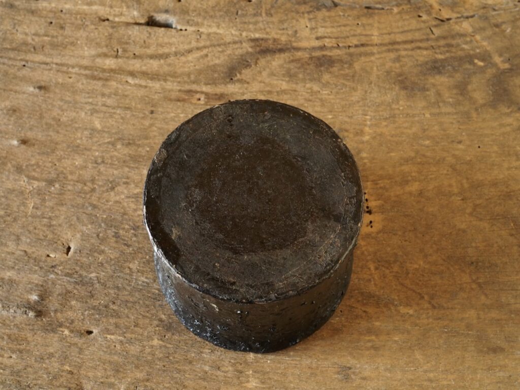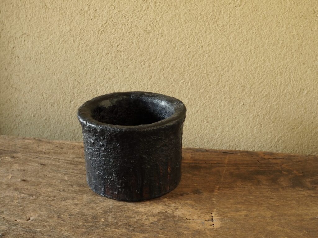 漆の作業場に置いて使用したと思われる漆桶で、分厚く丸みのある口造りや安定感の