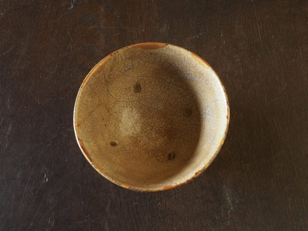 本手の瀬戸唐津茶碗で、柔らかく味の良いの長石釉と所々現れた卯の斑が深い表情を見せています。