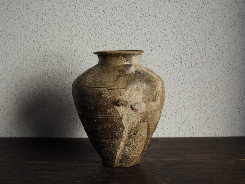 鋭い二重口に強い張りを見せる肩の稜線、そして小さな底部へ続くフォルムはまさに理想的な古窯の