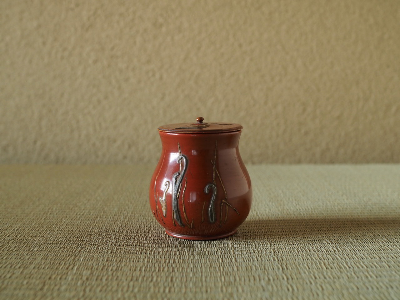 蒔絵、錫、螺鈿を用いて琳派風に描かれています。上品で薄造りの小壺形に少し落ち着いた