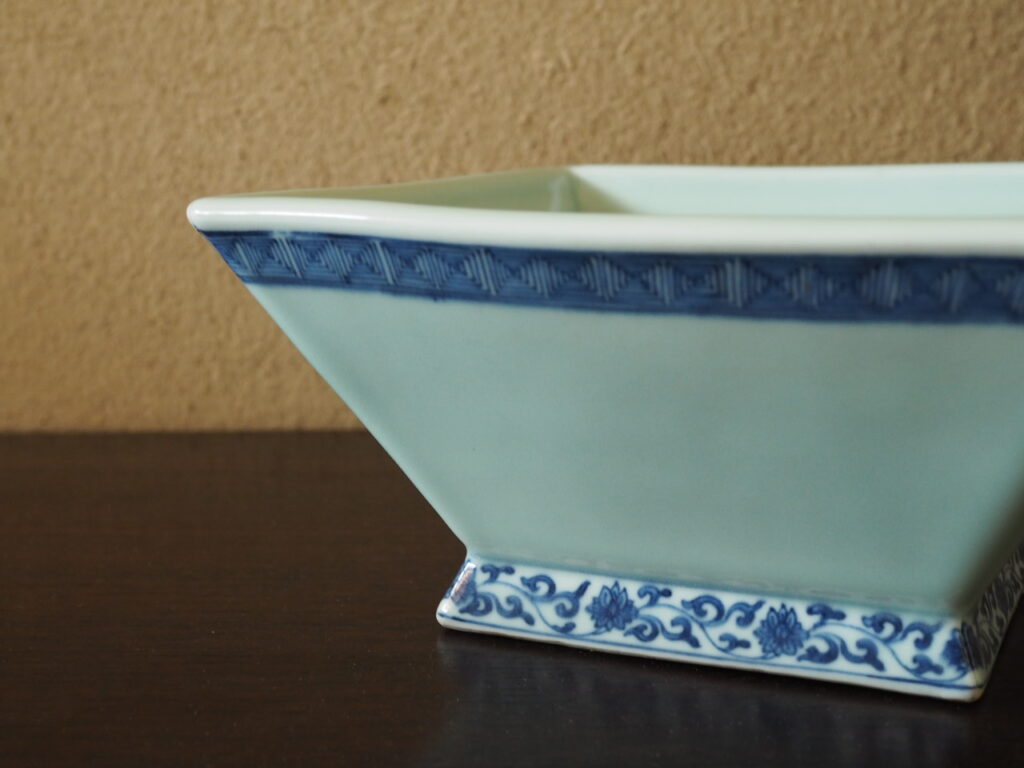 染付で描かれています。すっきりとした色合いや造形、磁器特有の艶やかさが目に涼しく大変上品です。