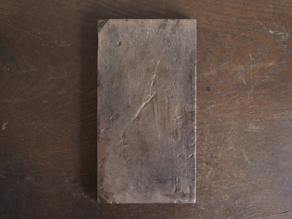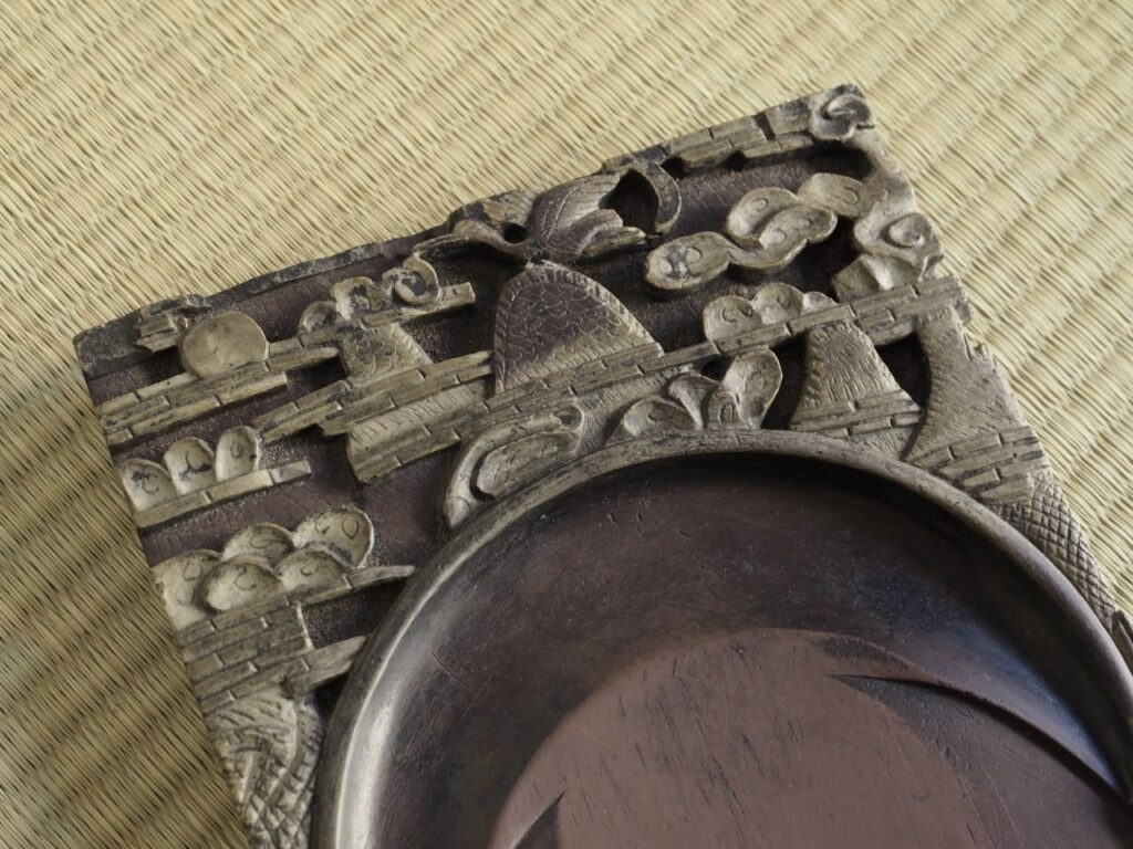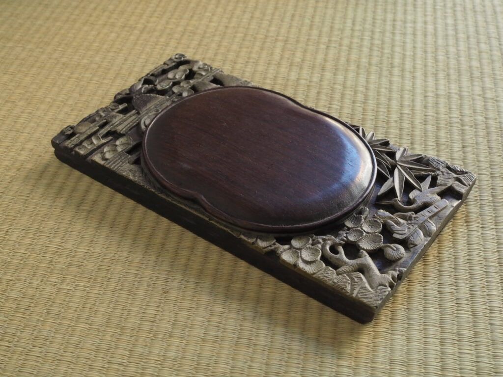 朝鮮半島北部で産出される暗紫色と淡緑色の二層になった渭原石の硯で、中央に日月形の墨池と