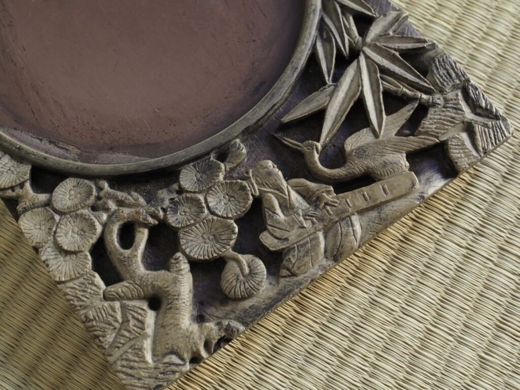 琴士の奏でる音色に合わせて歌う鶴の姿が彫り出されています。画面いっぱい吉祥文で埋め尽くし、