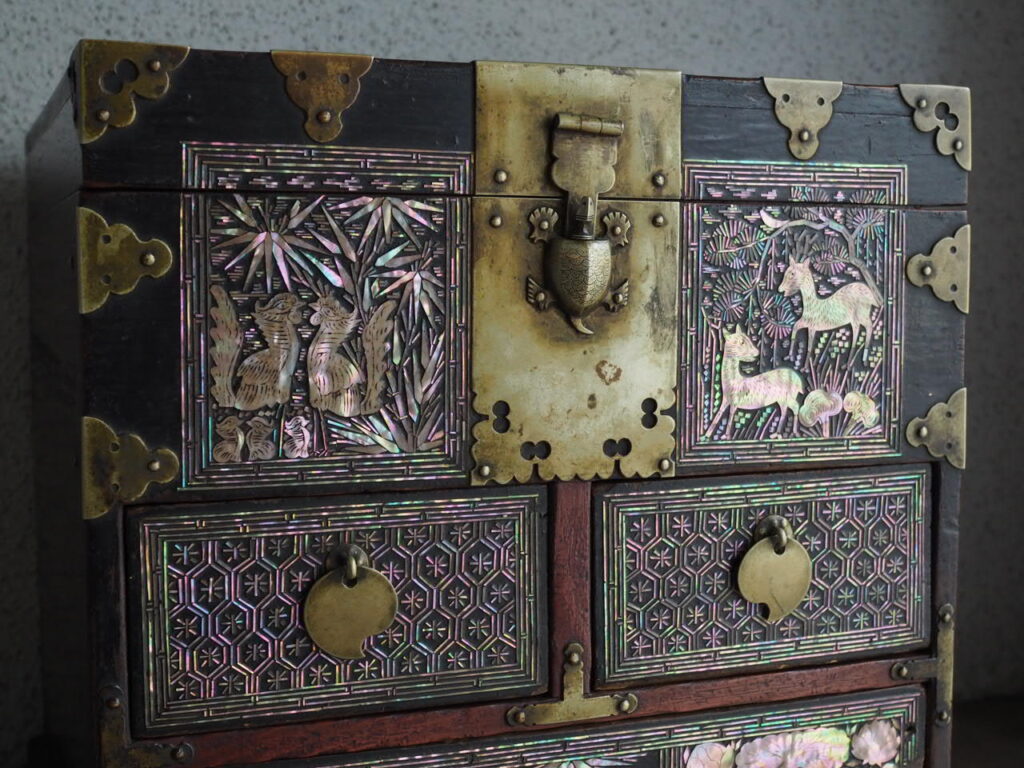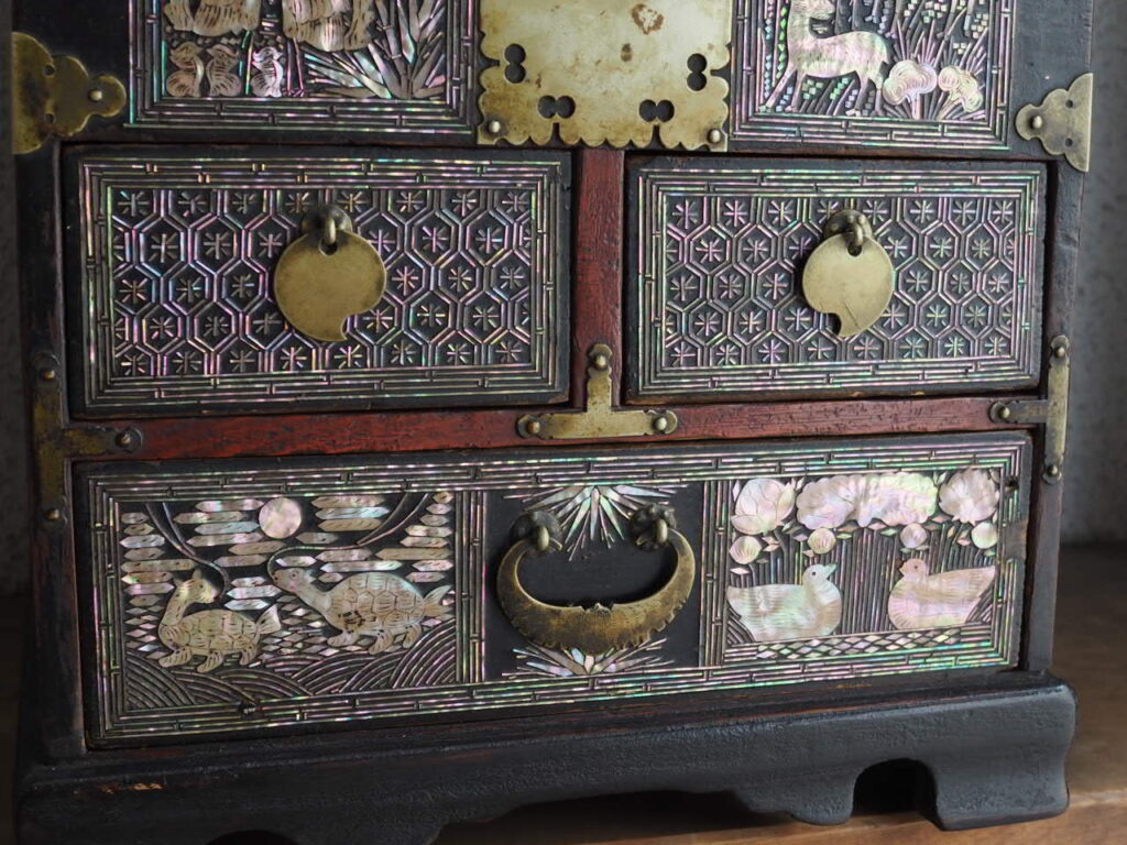 貴族階級の女性が用いた収納箱で、前面に施された螺鈿の煌めきに目を奪われます。