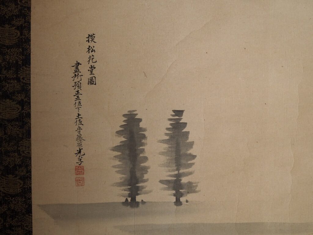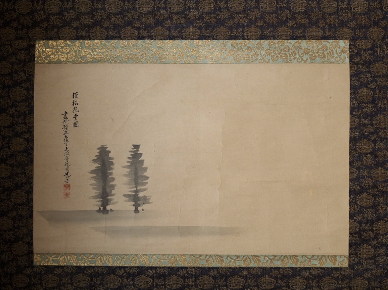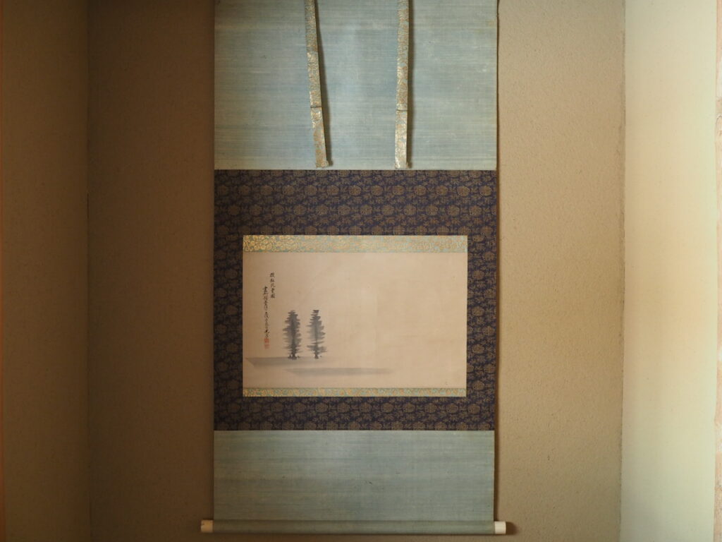 が写したもので、杉だけを簡素に描いた余白のある画が神々しく、また涼しげなウブ表具が上品です。