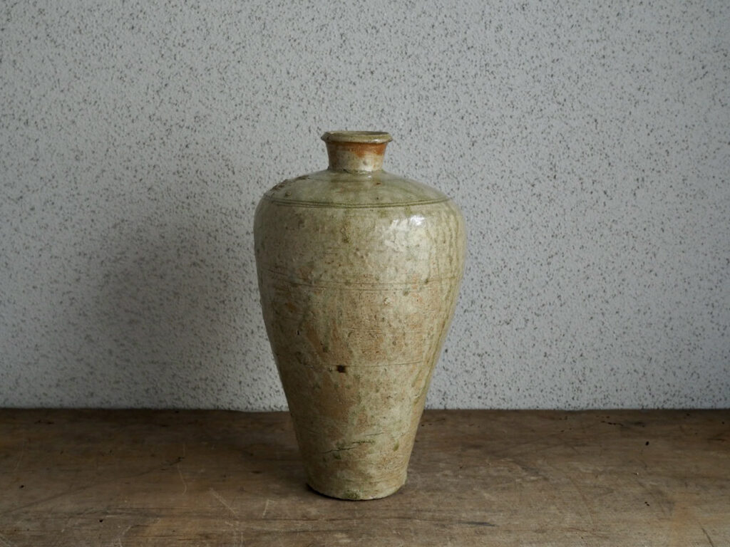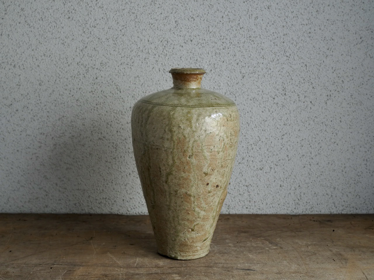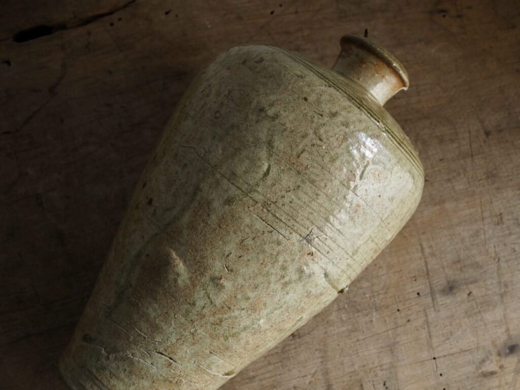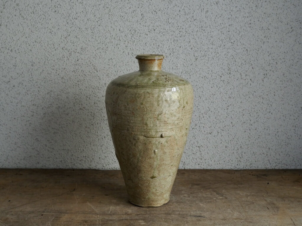 均整のとれた細身のシルエットが殊の外優美で、肩のあたりから流れ落ちる淡緑色の灰釉は火色が