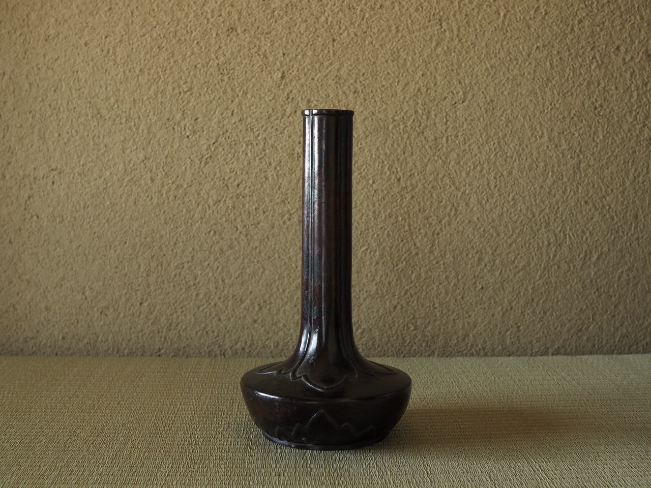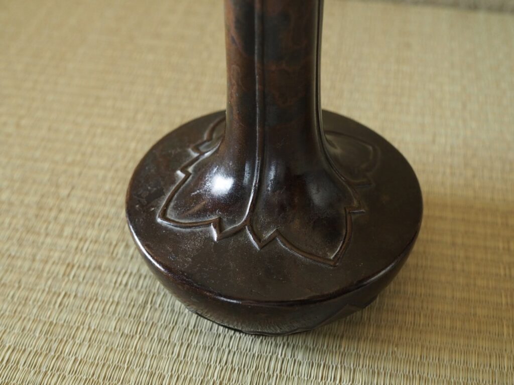 班紫銅と呼ばれる暗紫色の不規則な文様が特色の銅器で、でスルリと伸びた頸と低い胴部が描く