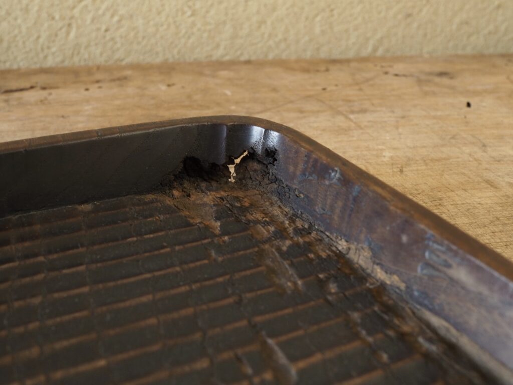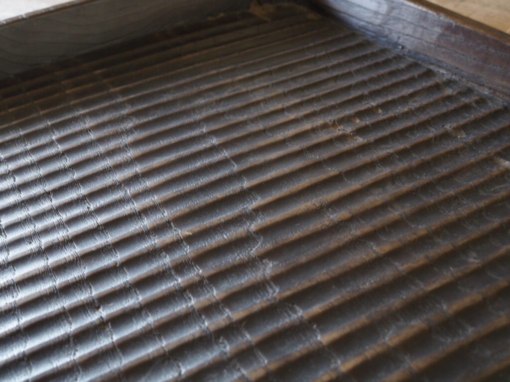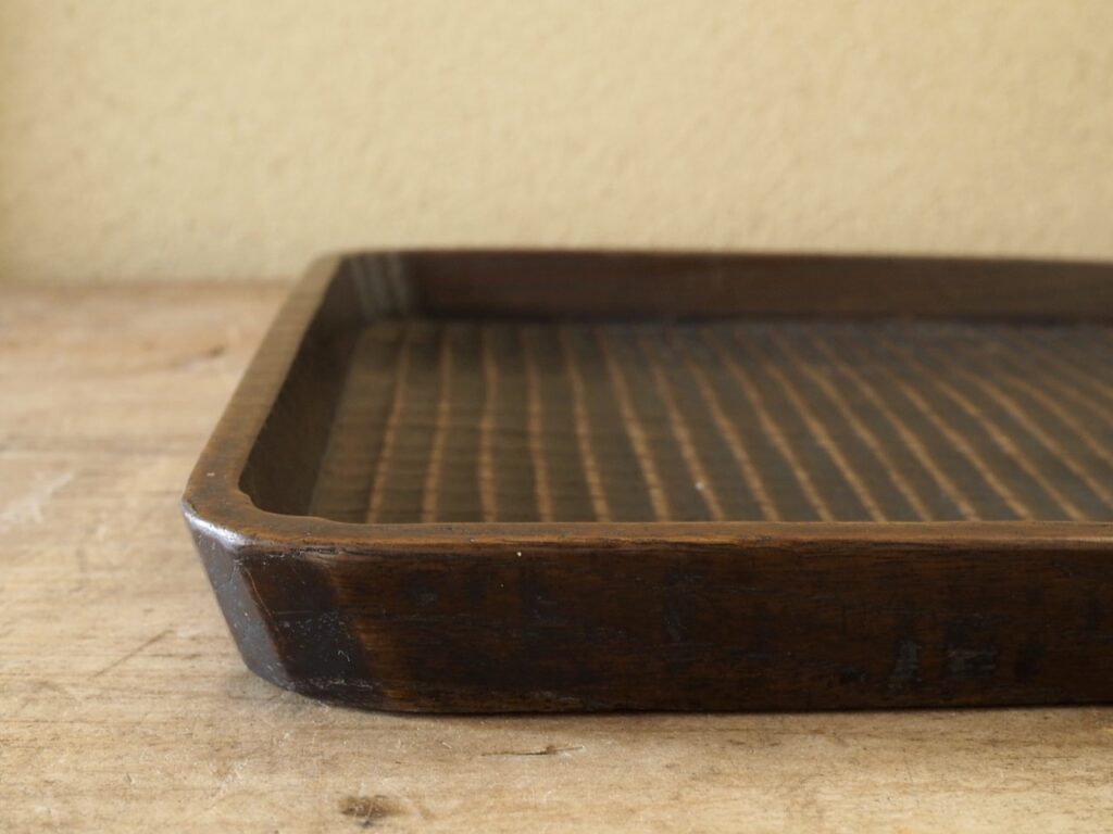 よく使い込まれた大型の我谷盆で、摩耗した底面の手触りの良さが心地よく、虫喰い跡や穴にさえ