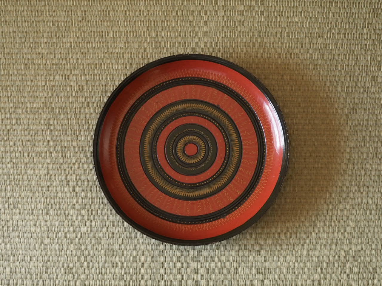 唐物の煎茶盆として伝世した紙のように薄く軽い漆器盆で、鮮やかな朱、落ち着いた緑、軽やかな