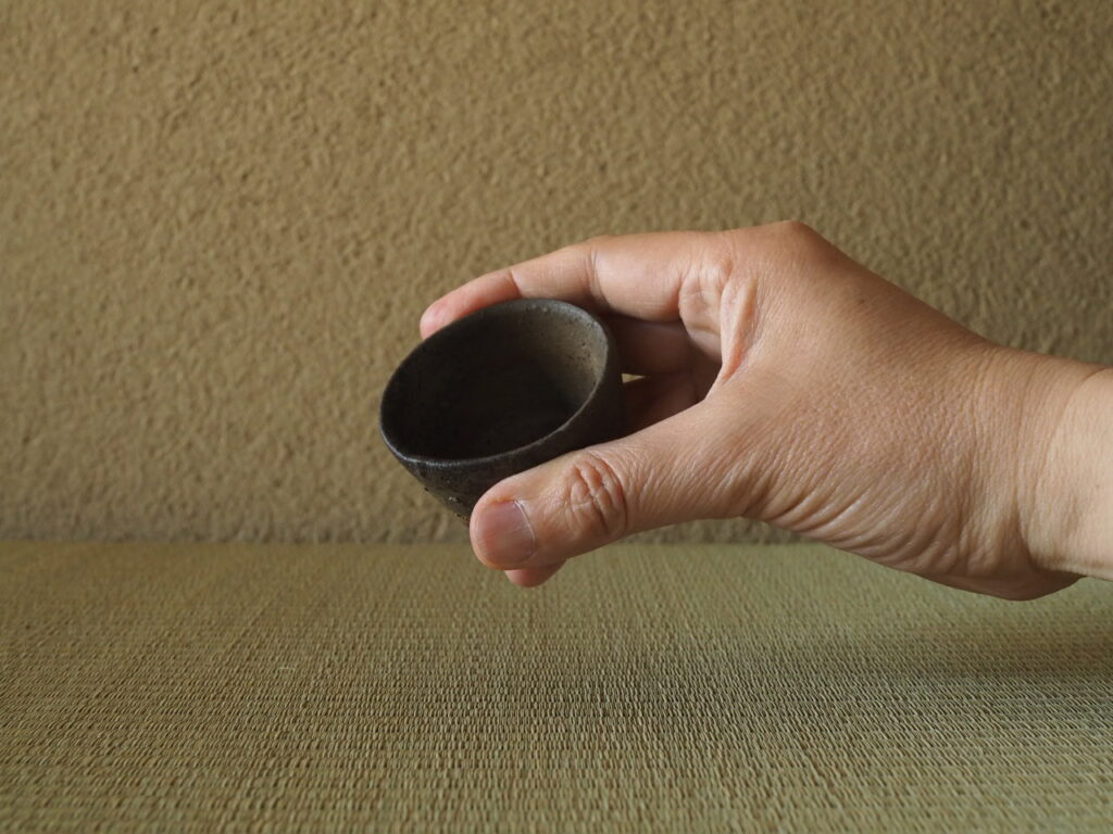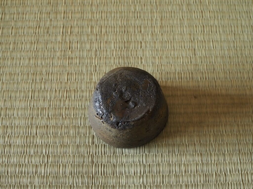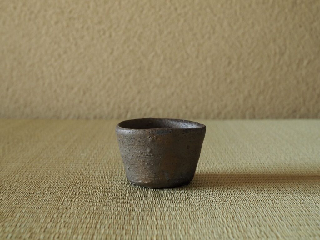 ピリッとした小振りのいわゆる種子島の筒盃で、所々窯変した焼締の肌は