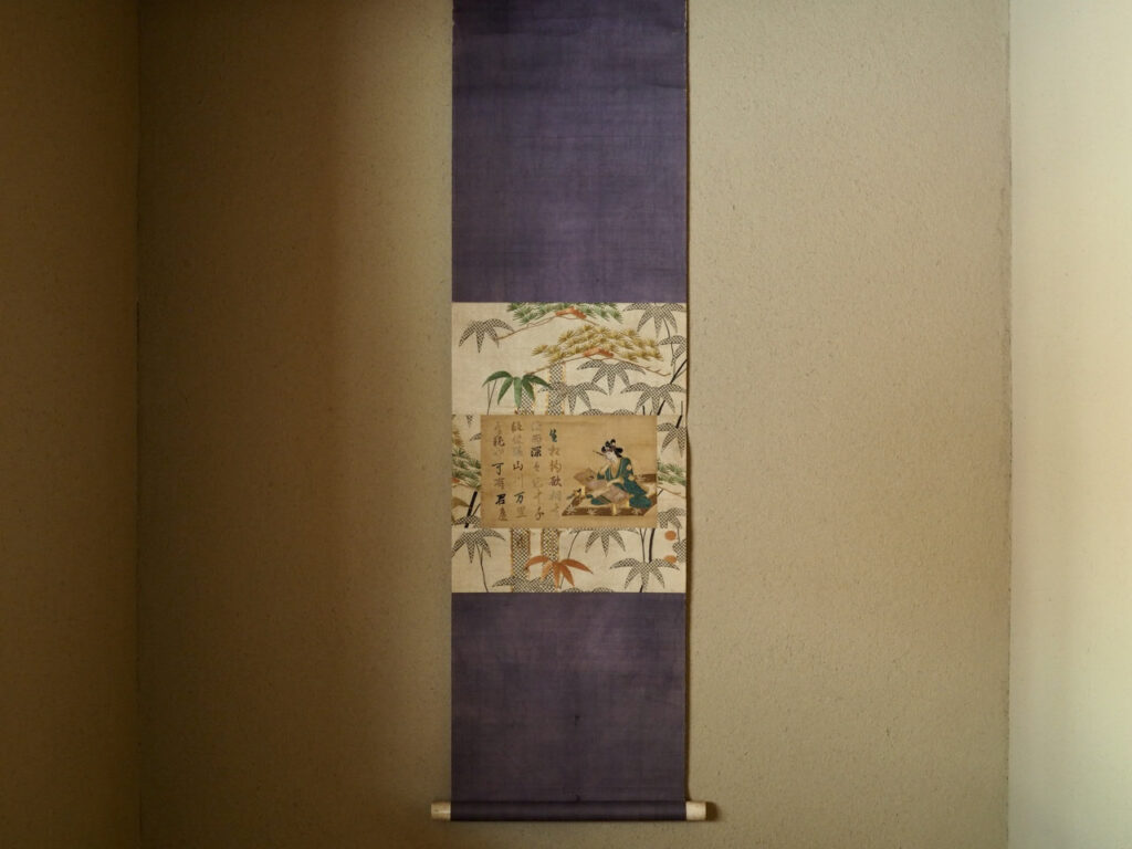 白綸子地の小紋裂を用い、上下の紫の絹裂と合わせた大変洒落た表装となっています。