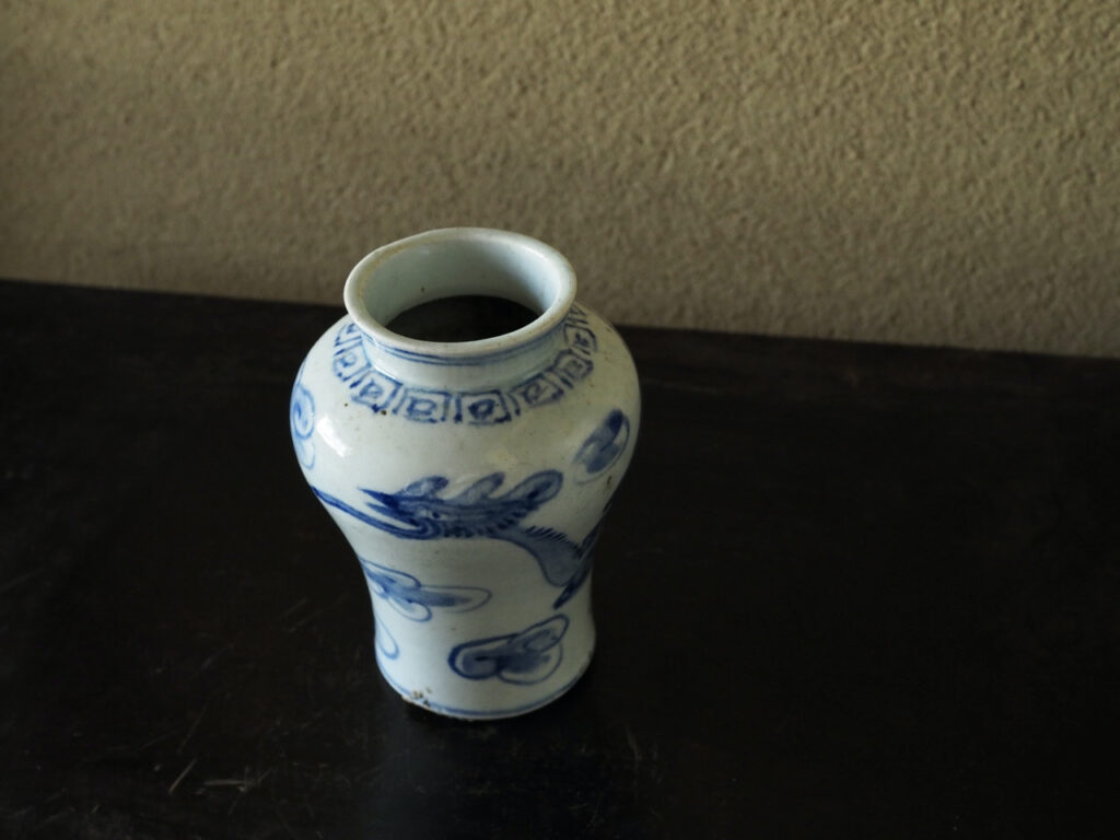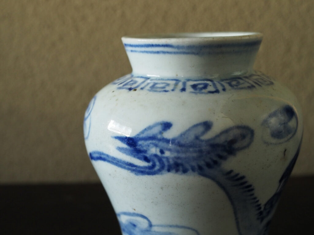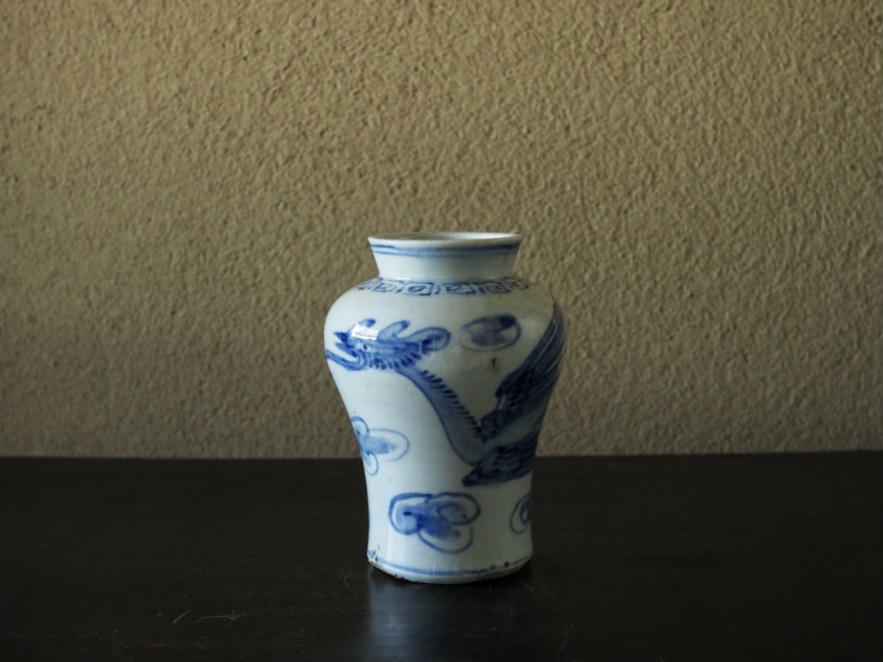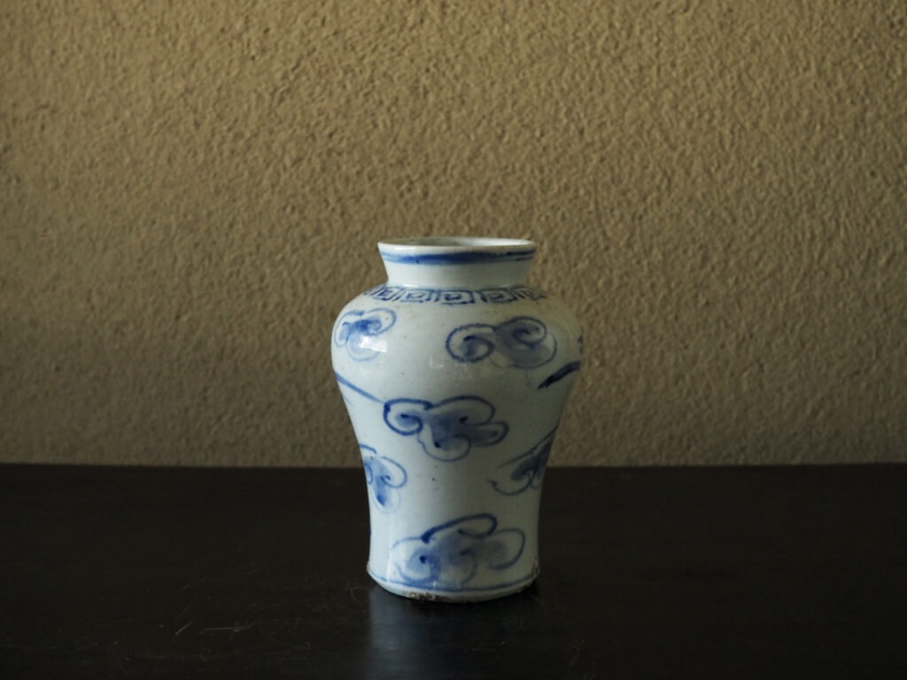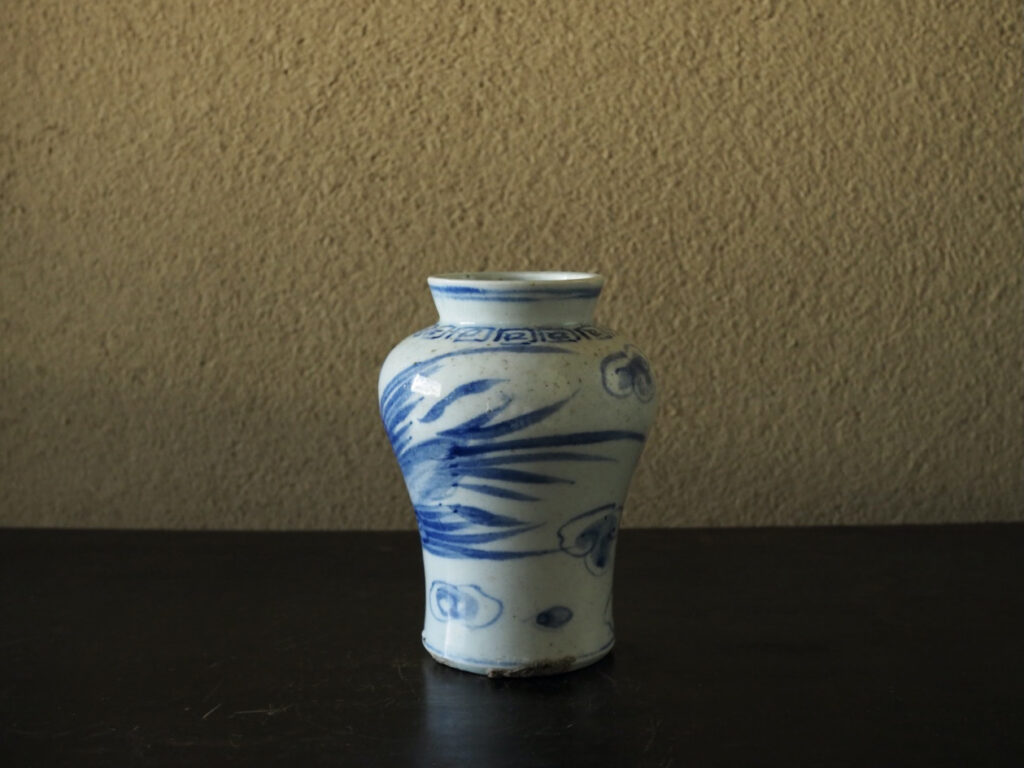 優美な稜線を見せる小型の立壺で、青味の強い呉須、磁肌が爽やか、そして