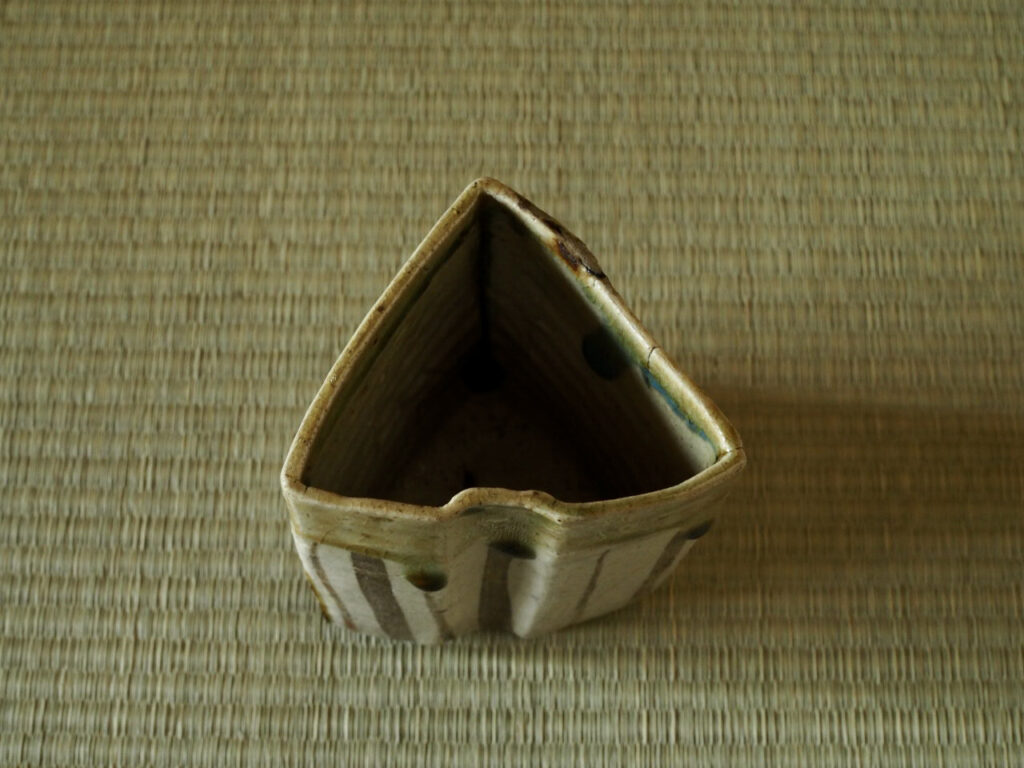 三角の特異な姿に桃山的破格を観てとれ、抽象化された「M」のように見える吊柿文や縞文の