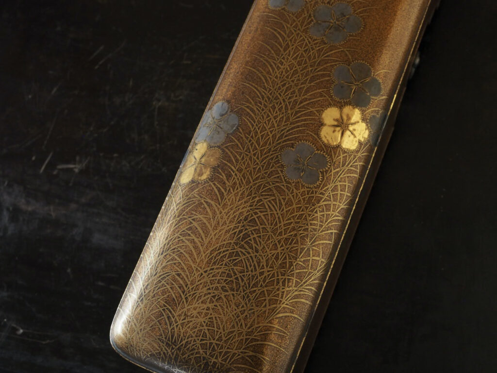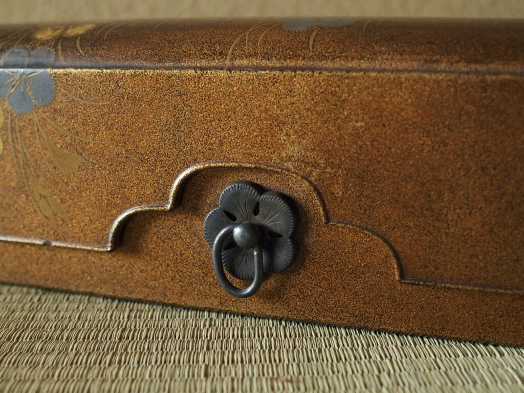 大型の蒔絵文箱で渋味のある梨子地に撫子の花が凛々しくも煌びやかに描かれています。