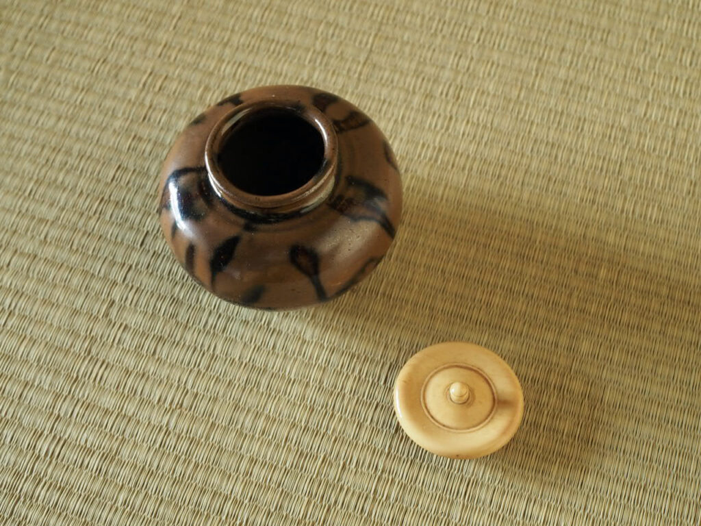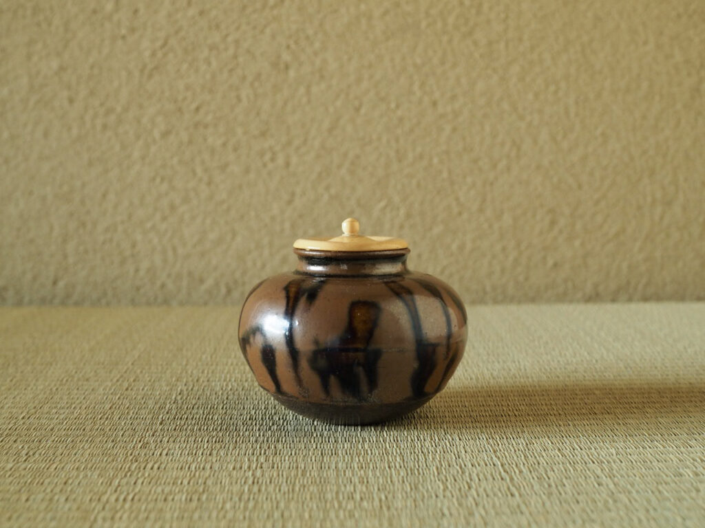 点々と灰釉を掛け、その流れ落ちる様の風情の良さが茶味深く、ピリッとした佇まいは、