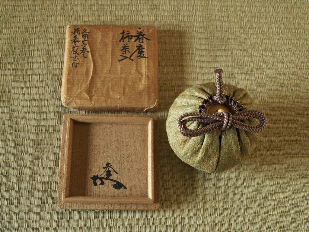 表千家 久田宗参(1765~1814)箱書 仕覆裂「萌葱地二重蔓牡丹唐草文金襴」
