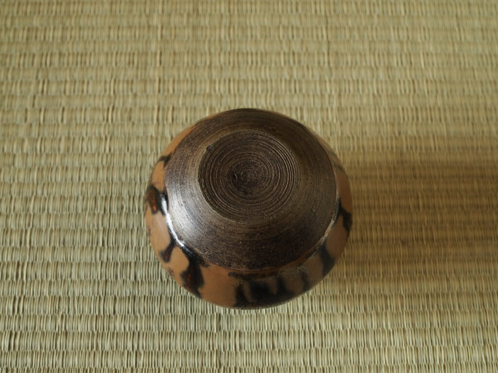 薄造りで手取り軽く、ぷっくりと張り詰めた柿形の胴に緊張感が漲ります。柿釉の地に