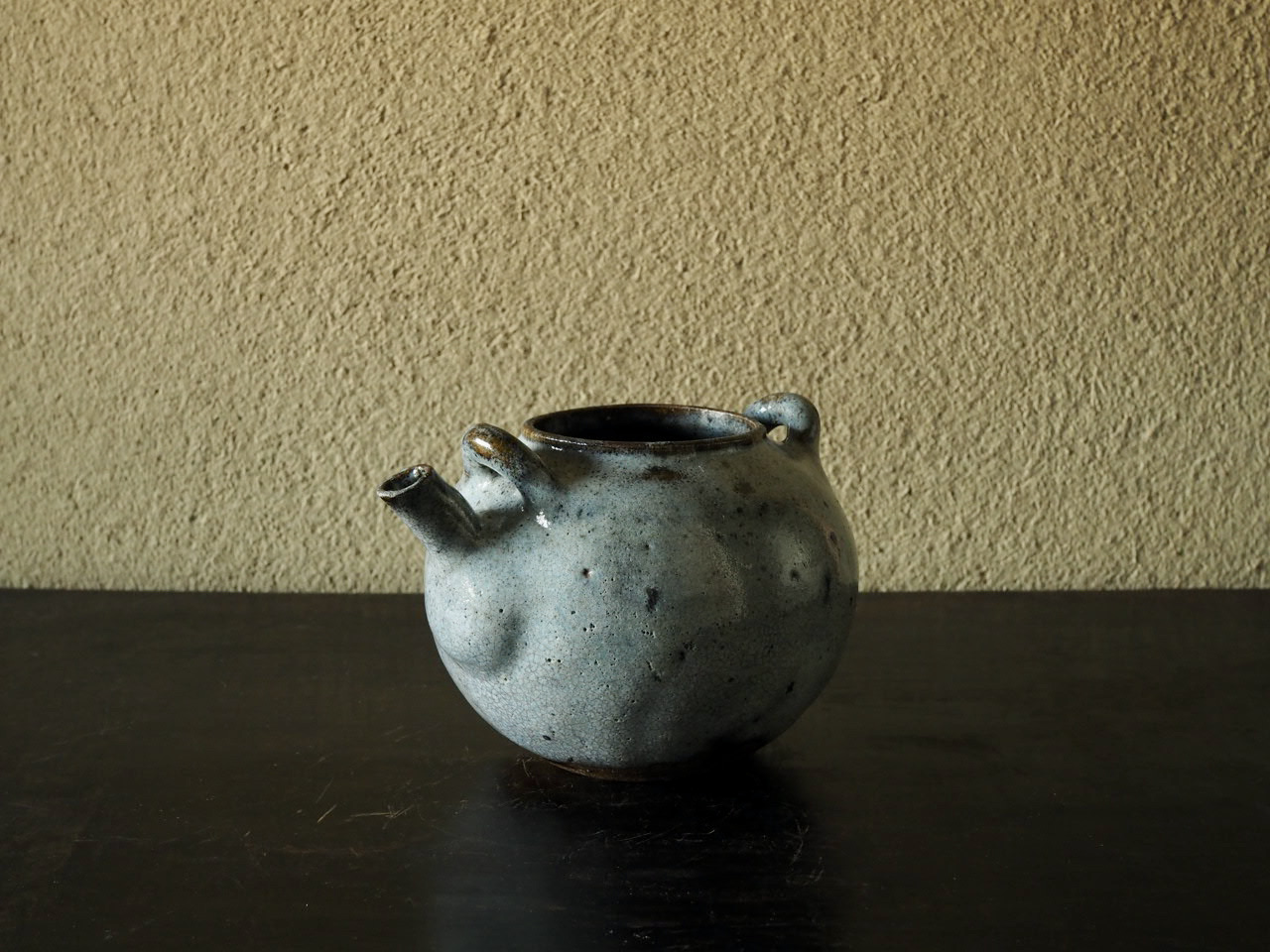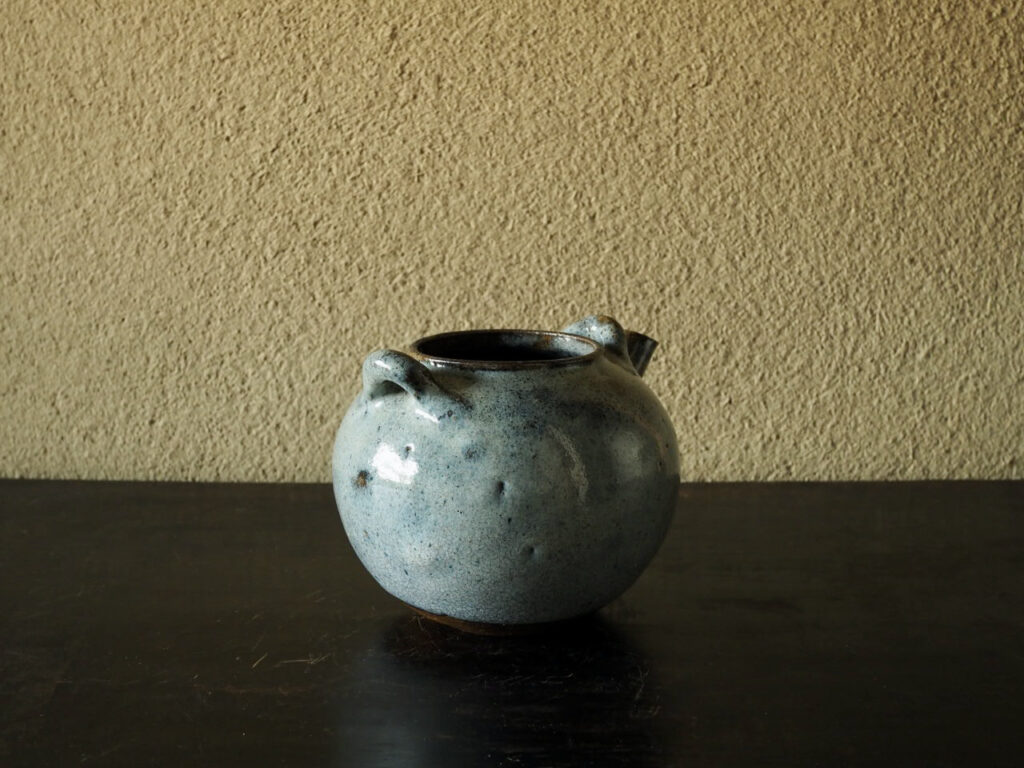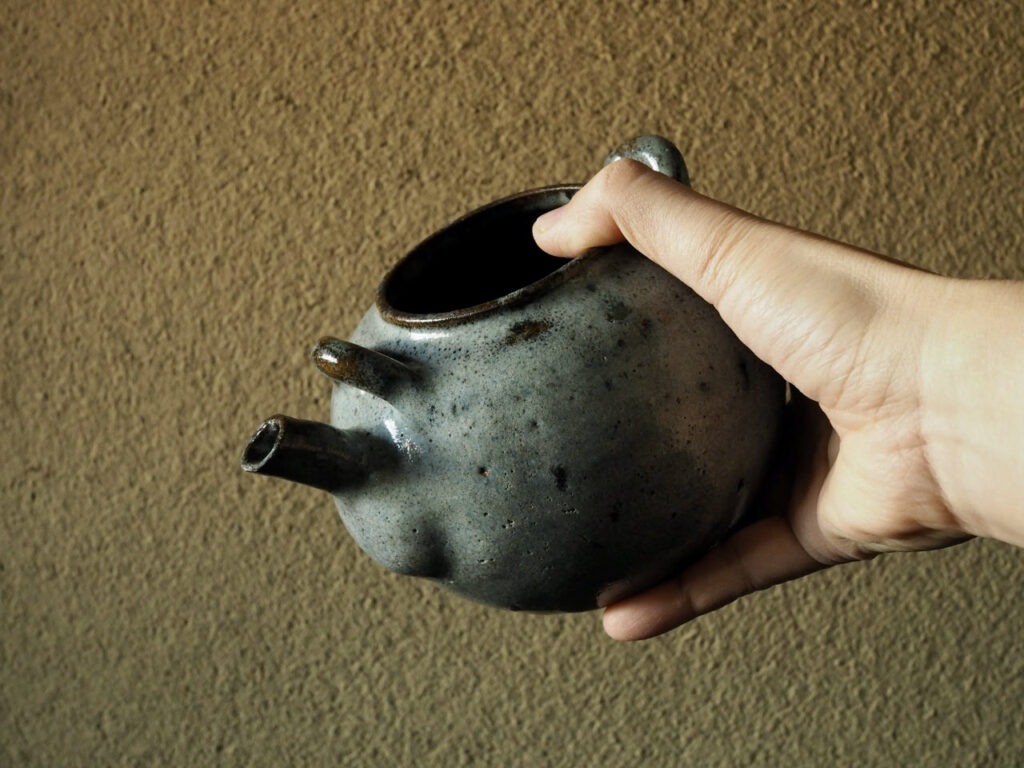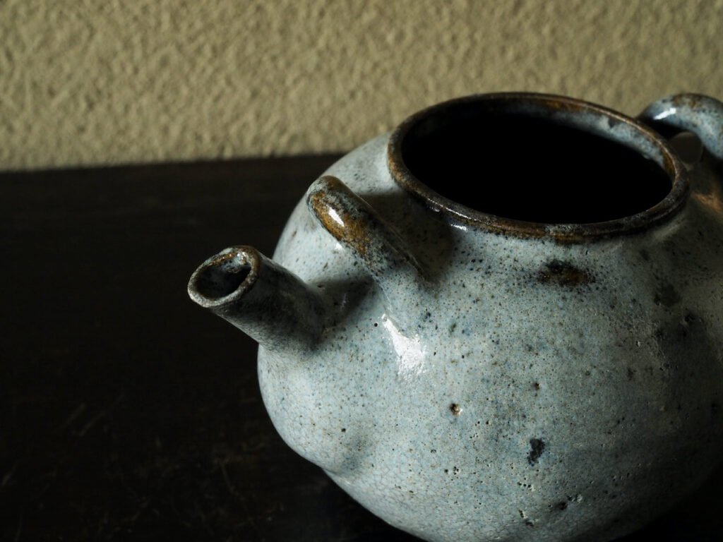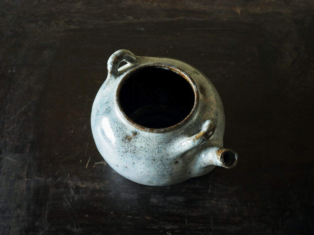 金属製のツルを付けるタイプの土瓶で、青味の強い藁灰釉と高台周りの褐色とのコントラストが