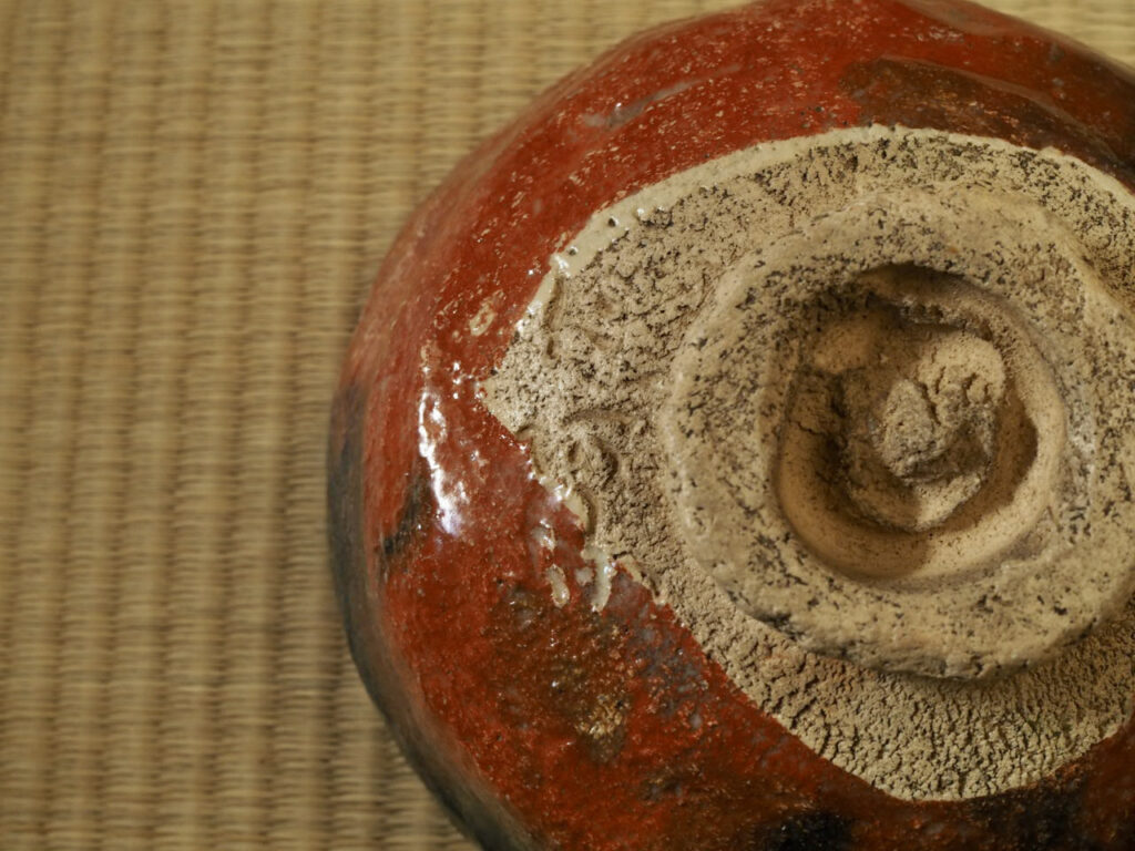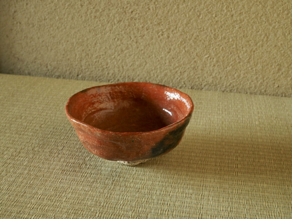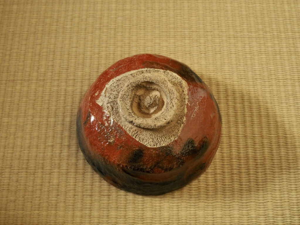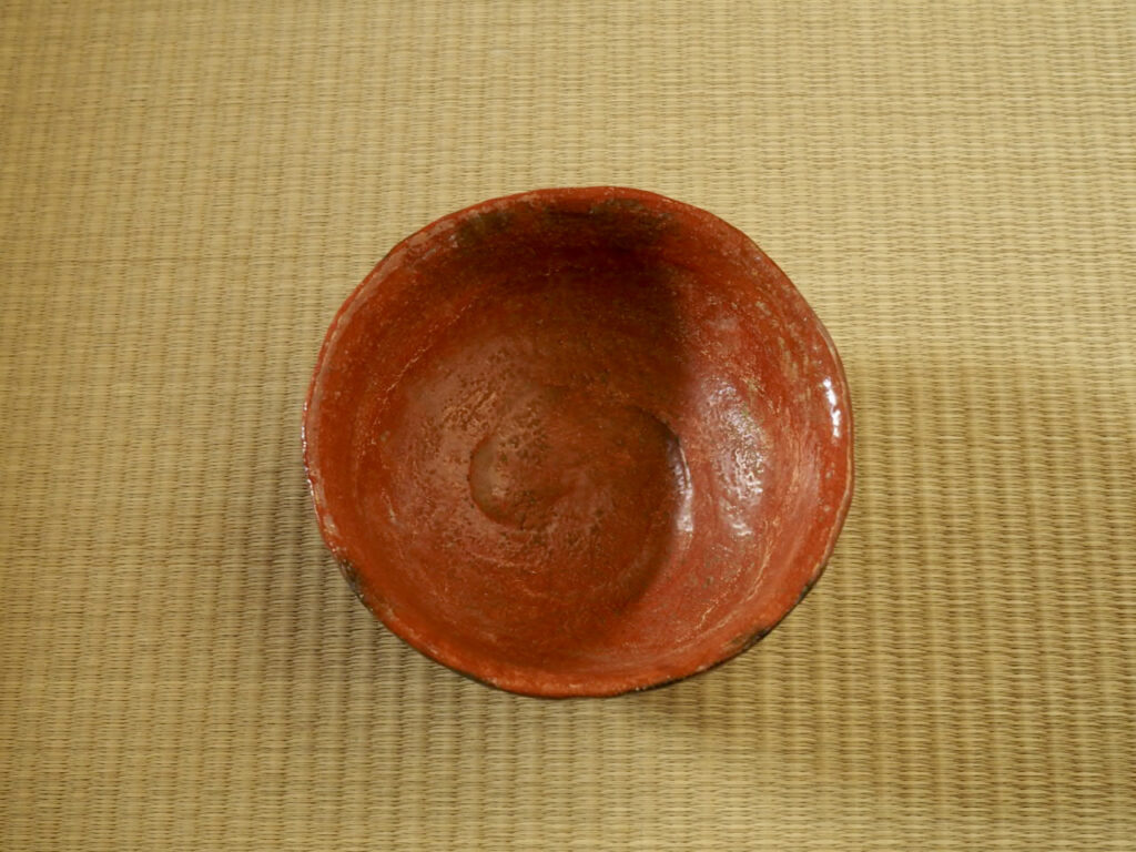江戸後期の京を代表する名工、仁阿弥道八の赤楽茶碗です。仁阿弥独特の鮮烈な赤が印象的で