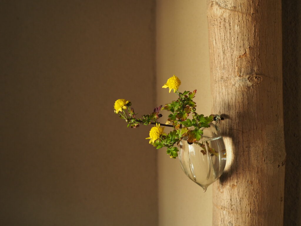 掛花入には珍しい小さなサイズに、やや緑がかったガラスの色と筋目の入った意匠が大変洒落ています。