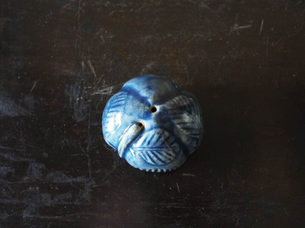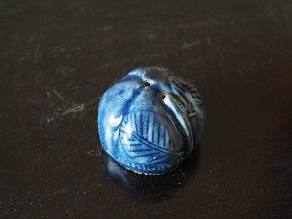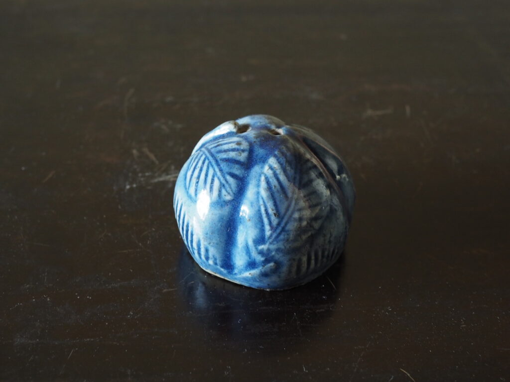 三枚の葉が描かれるのも珍しく、陰刻や窪みに溜まる瑠璃釉がみずみずしく爽やかです。