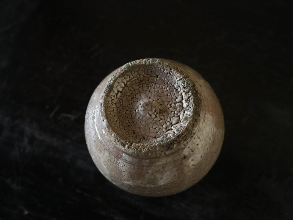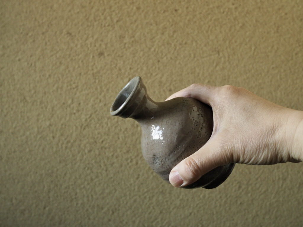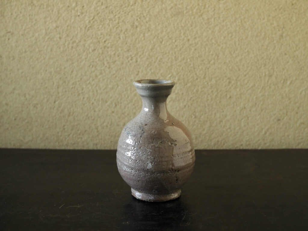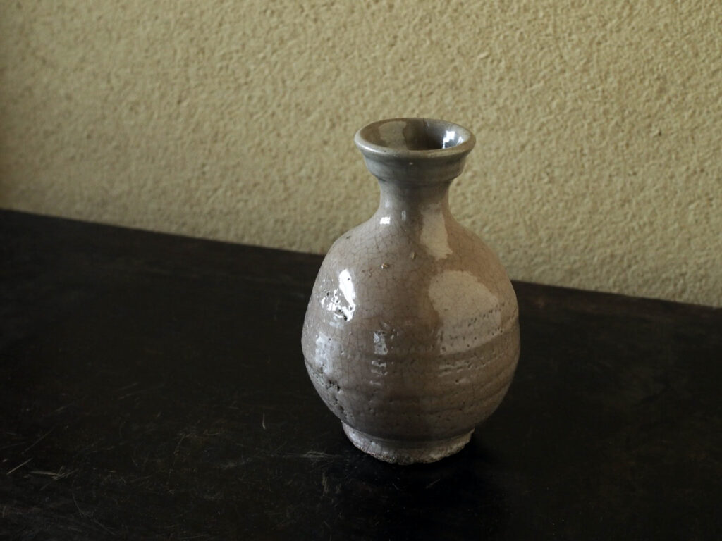 赤アガリの井戸釉徳利で、つややかな釉調に高台にあらわれた梅花皮が最大の見所です。傷も無く