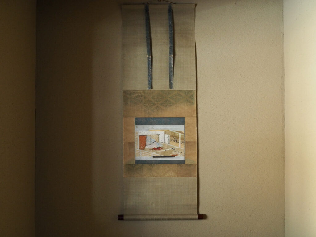 緑と黄が淡く入り混じる綾織の裂を中廻しに使った古裂表装も大変洒落ています。