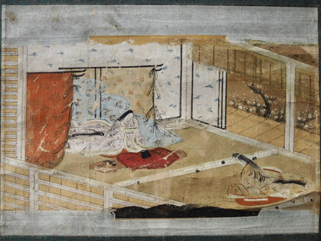 梅の咲く頃、上畳の女性が思いを馳せる男性を亡くしたのか、琴の上に載せた烏帽子と衣を前に