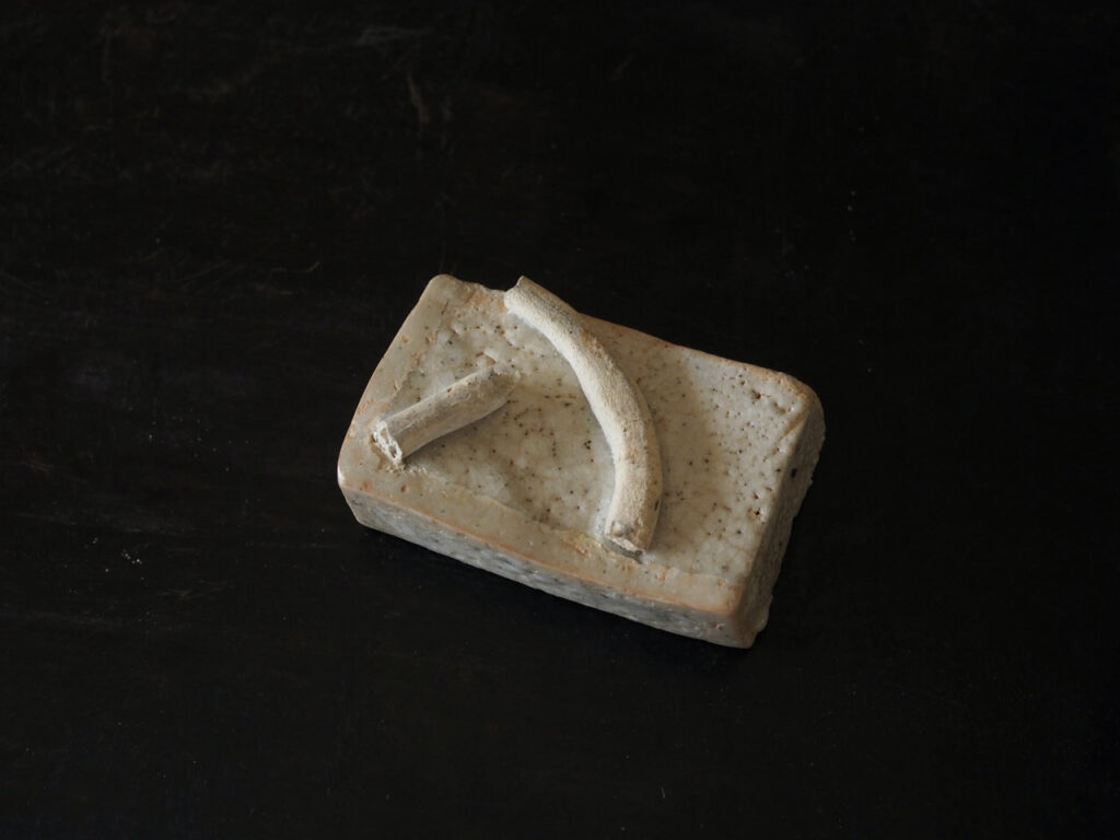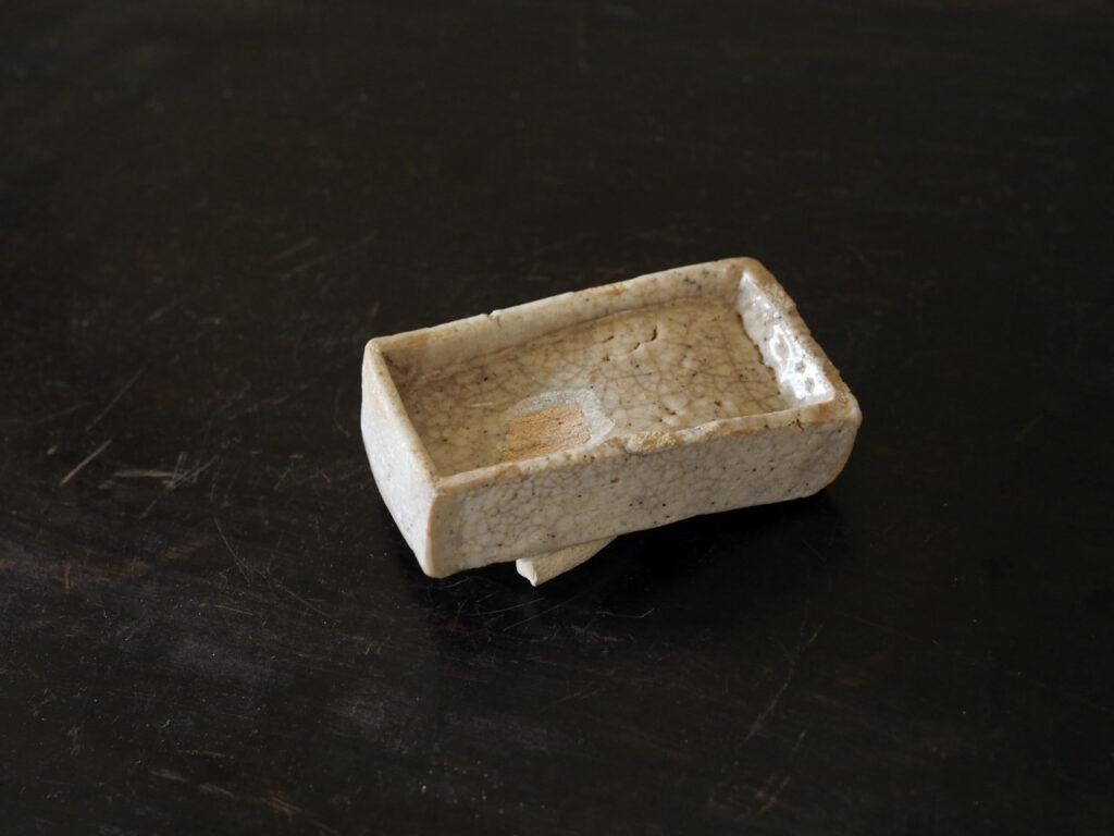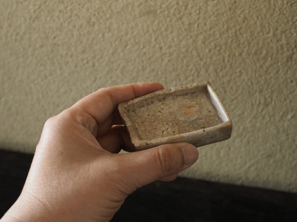 これは珍奇な、志野の角皿の陶片を呼び継いで創った小さな陶硯です。曲がったところを
