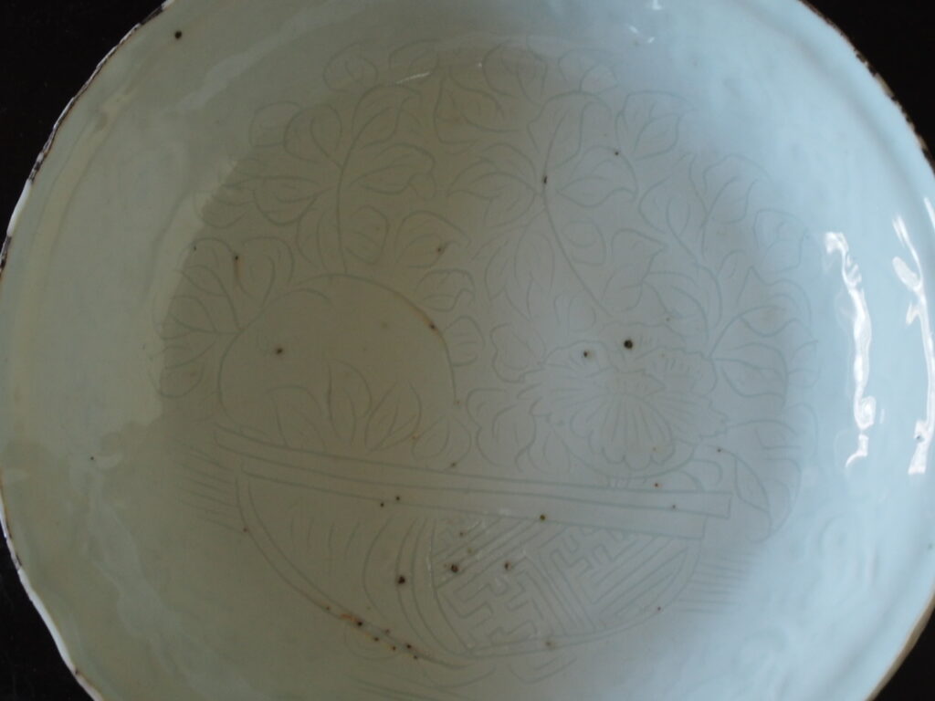 カリッとあがったつややかな磁肌が魅せる白は爽やかで、陰刻で表された牡丹や桃は活き活きと