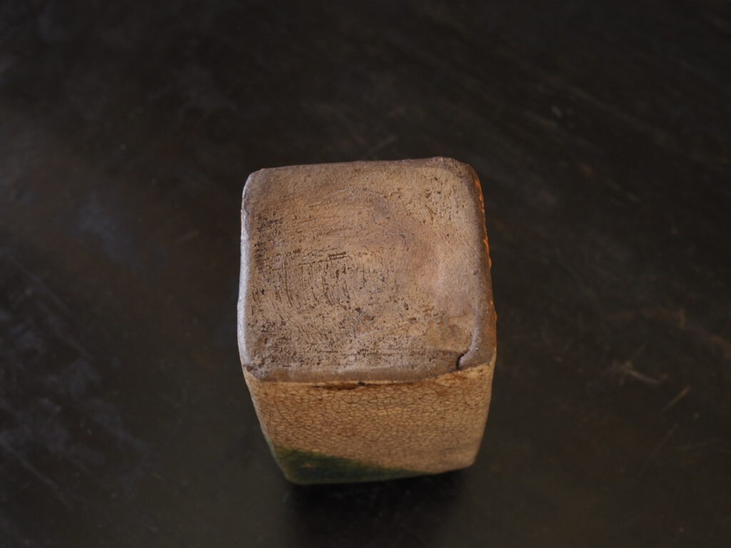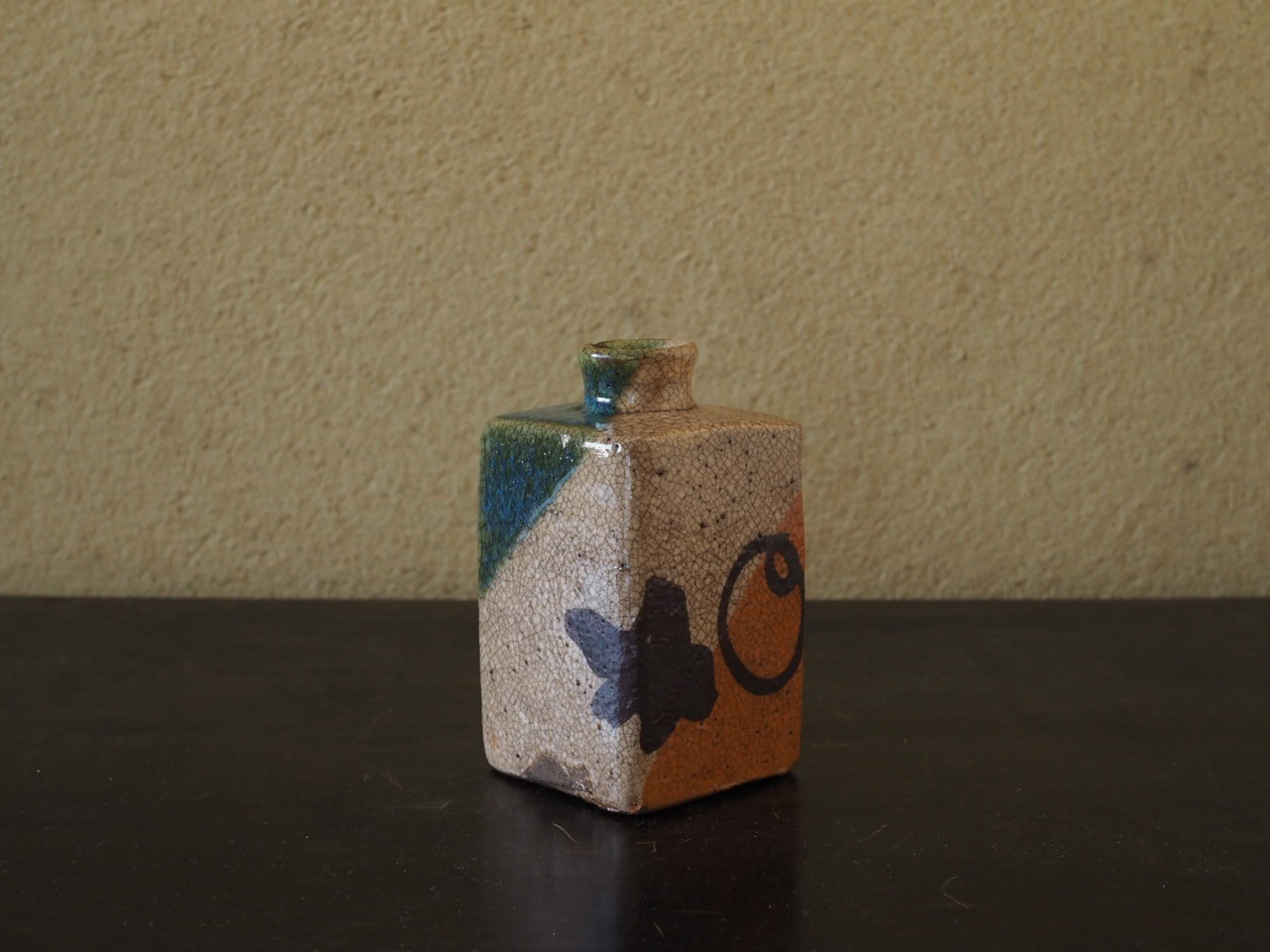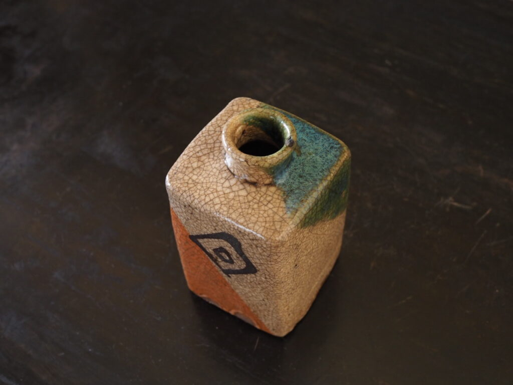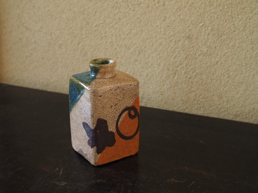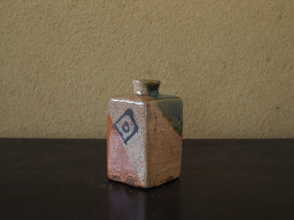 四方面取の姿に、緑、白、橙色の三色斜め掛けの彩りが洒落ています。鉄絵による四角、