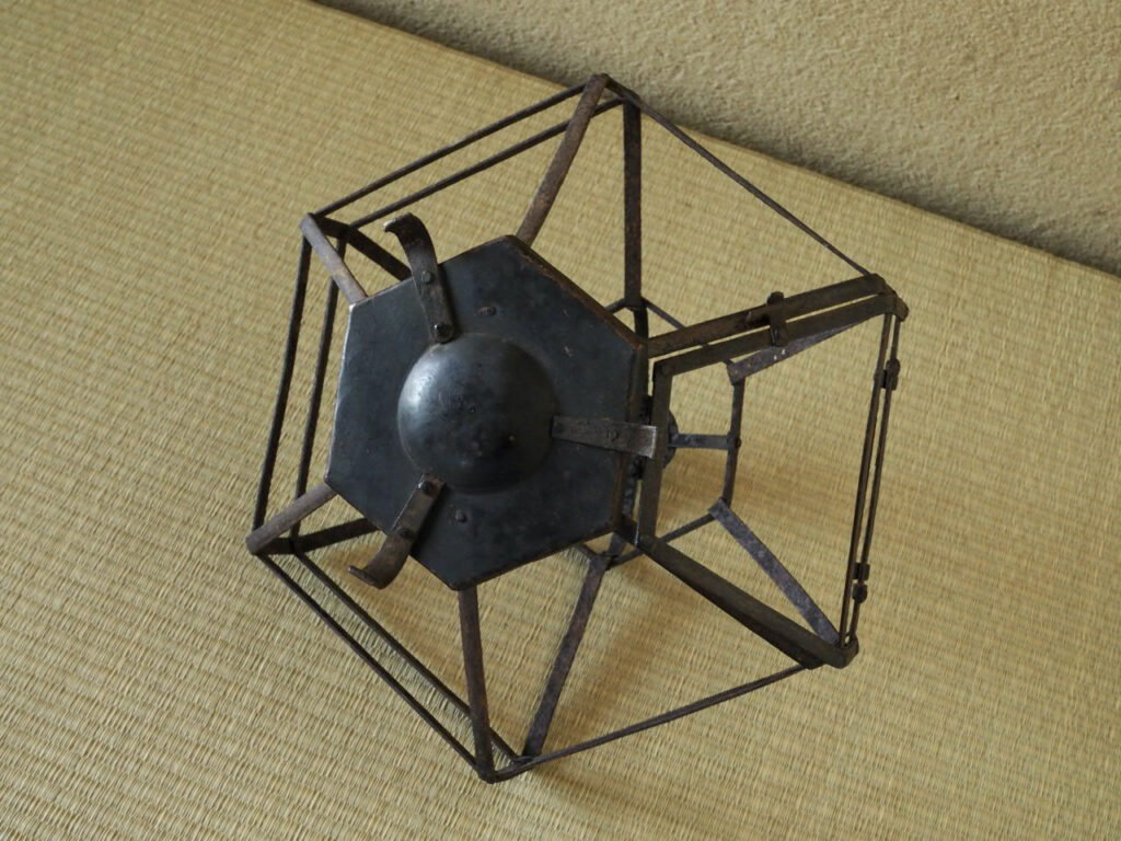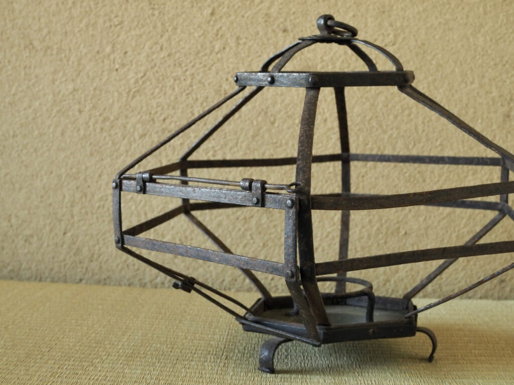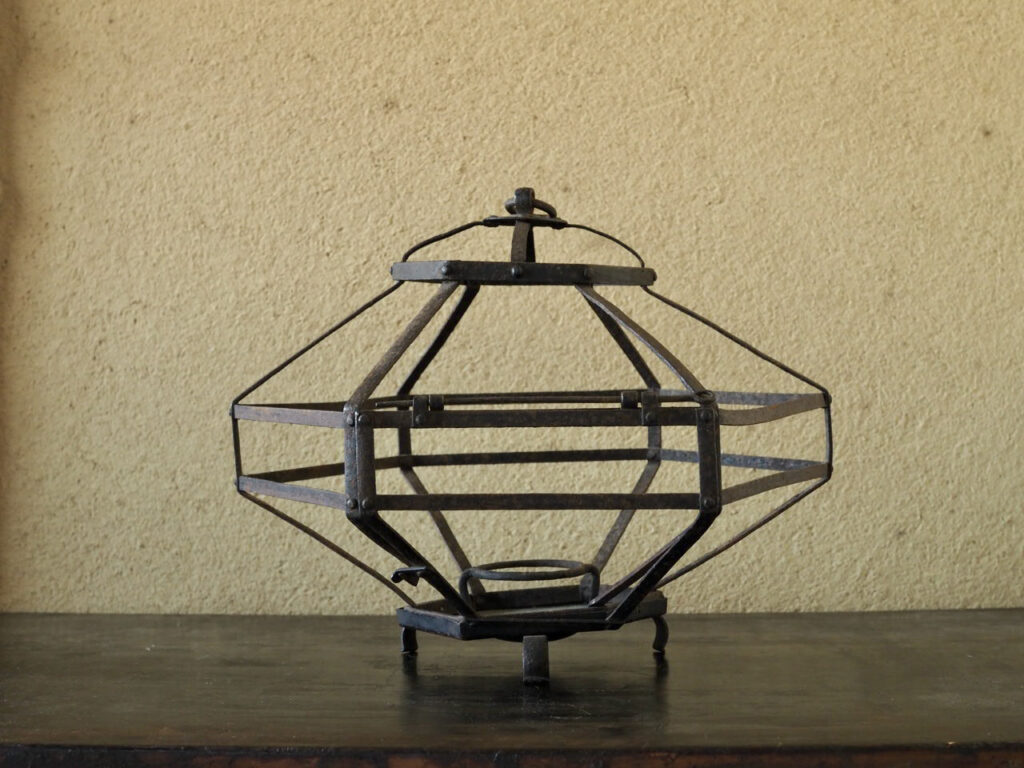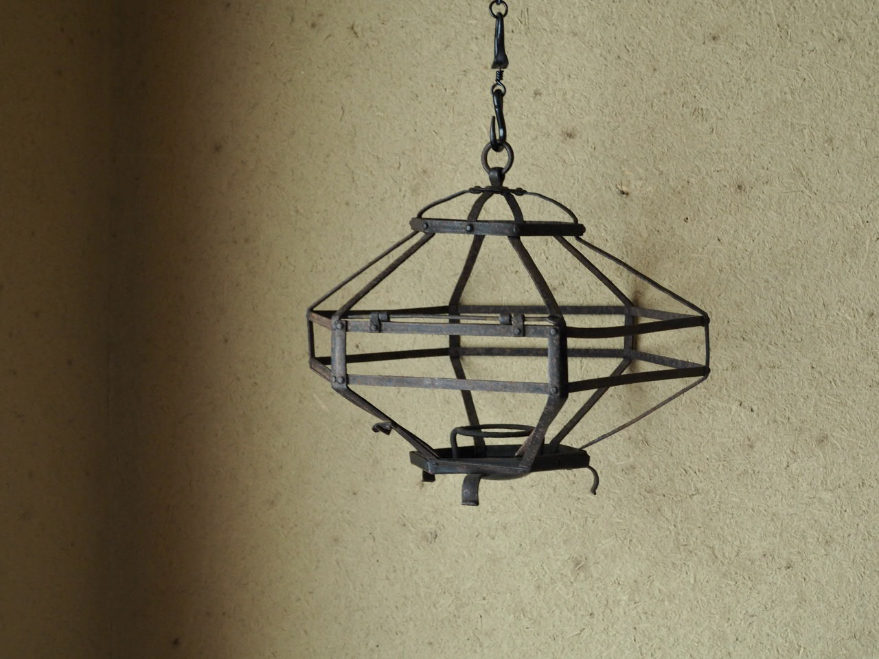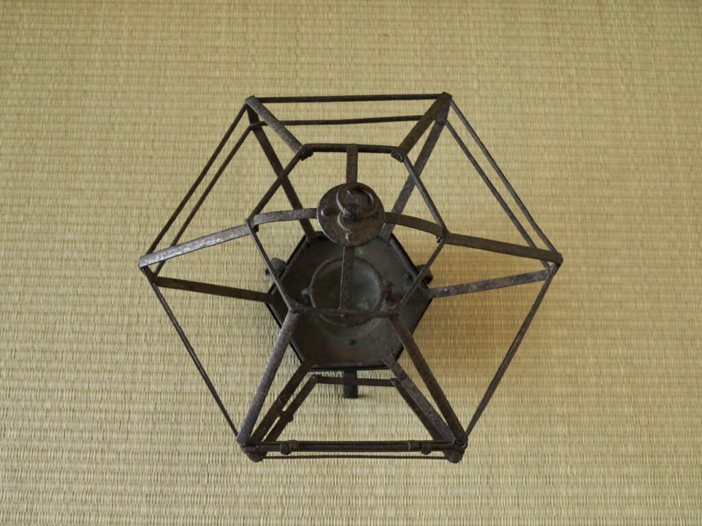 スッキリとした六角面取の行燈で、華奢な骨組みが見せる繊細な佇まいと素直な鉄味が
