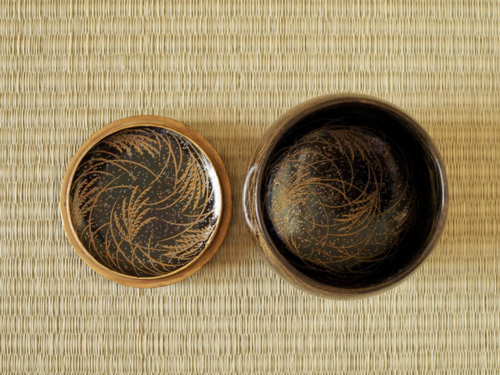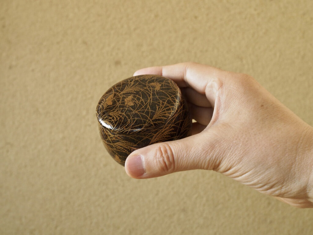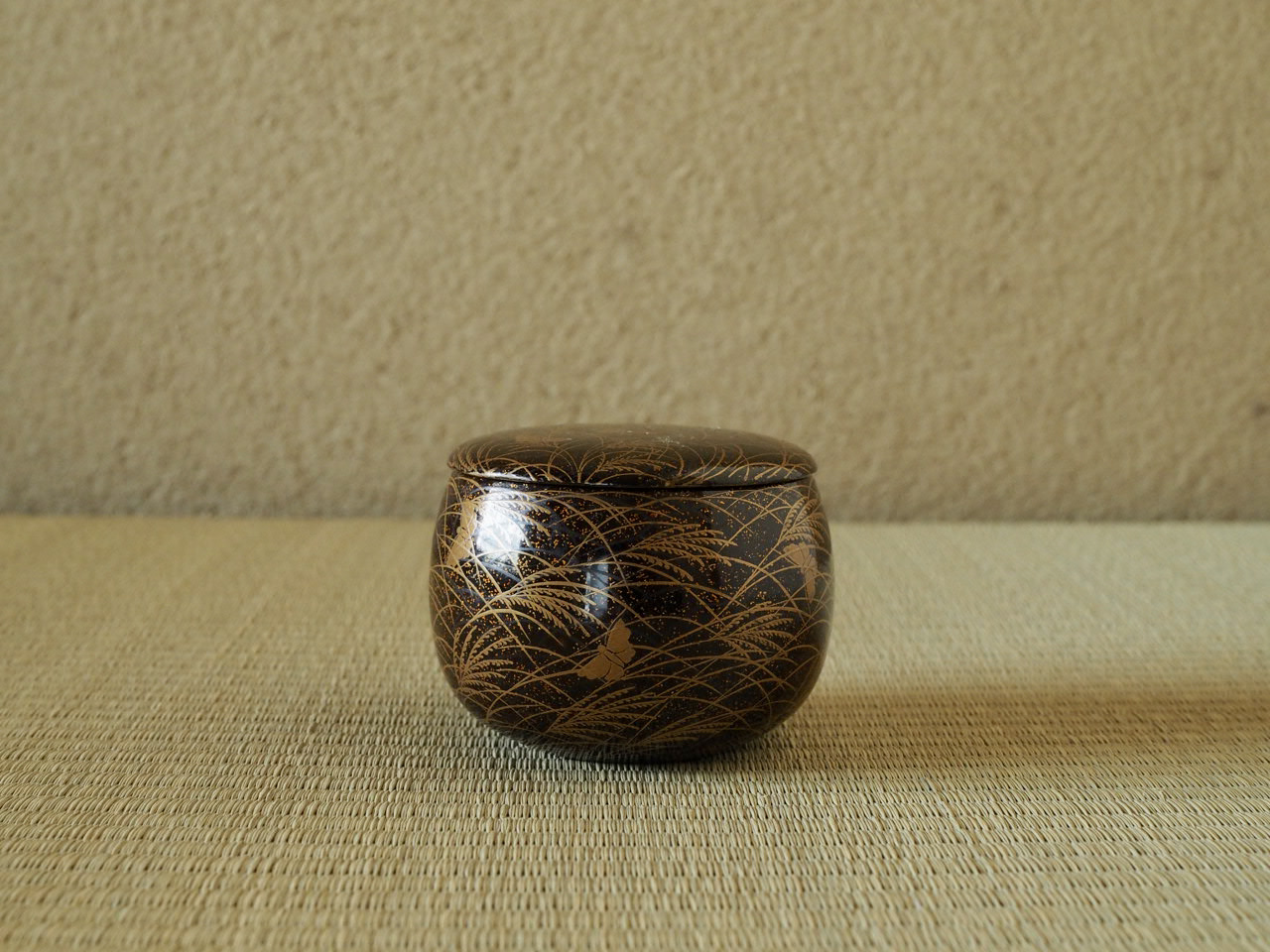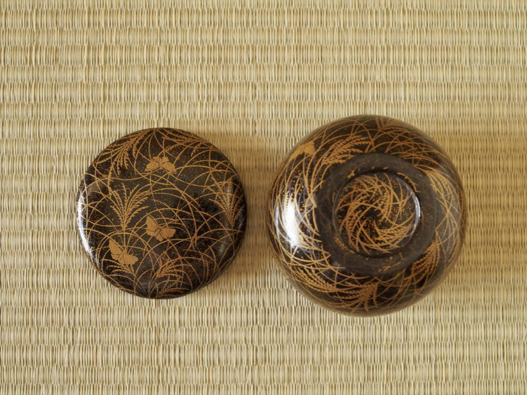 珍しい碁器形の蒔絵茶器で、外側は梨地に金銀蒔絵による芒と蝶の図が繊細な筆で描かれ、夏から秋に