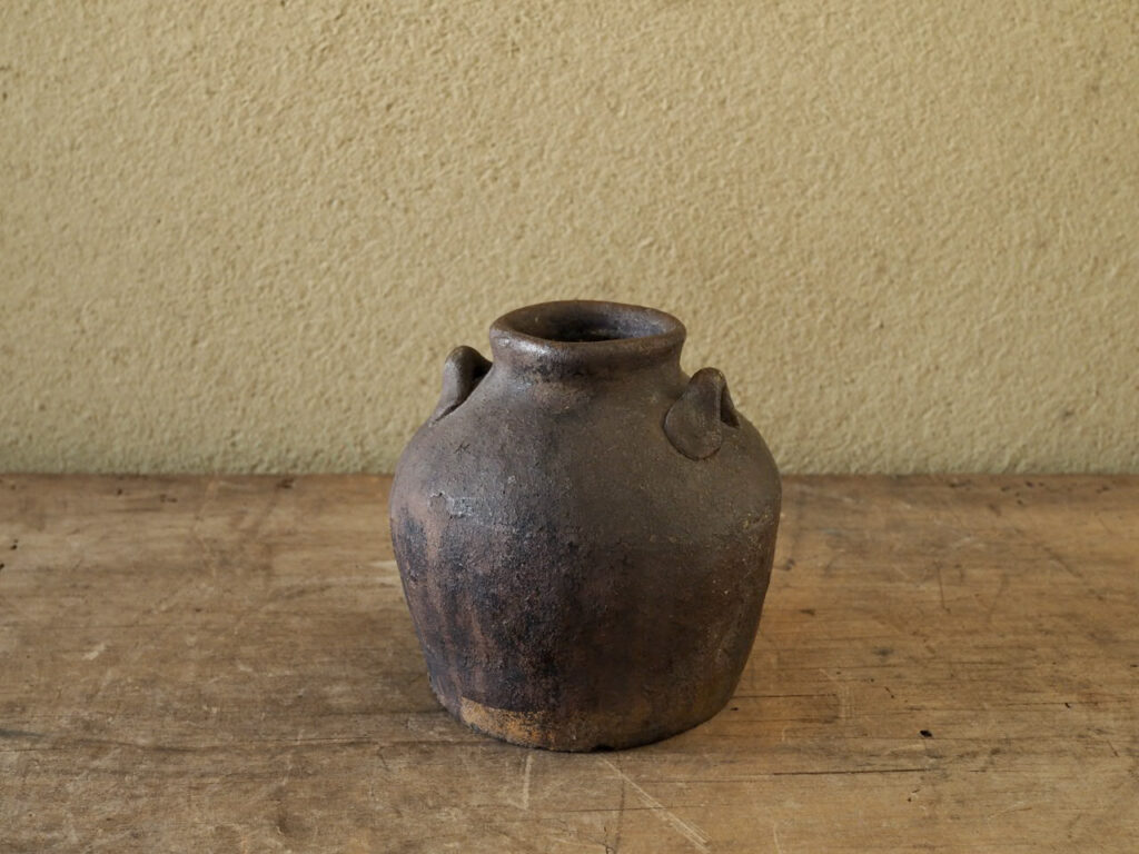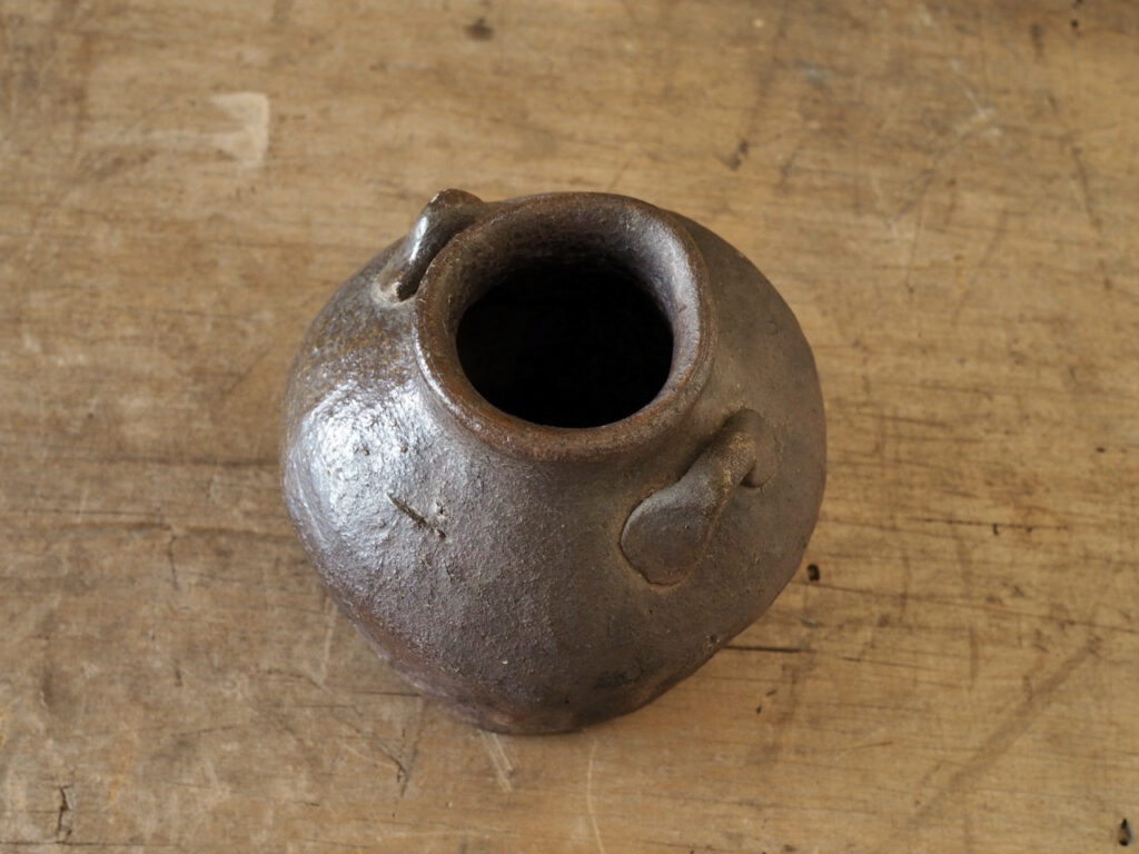 健全なる両耳に「一」の窯印が、いかにも越前お歯黒壺らしいです。壺として決して激しい景色を