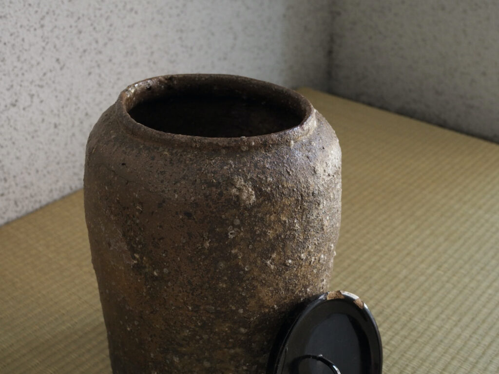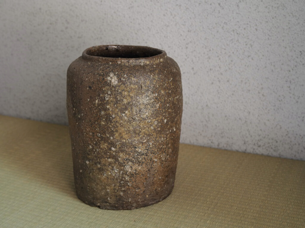 控えめな造形に、渋みのある土膚と黄褐色の釉景色がいかにも侘び枯れた様子を見せており、