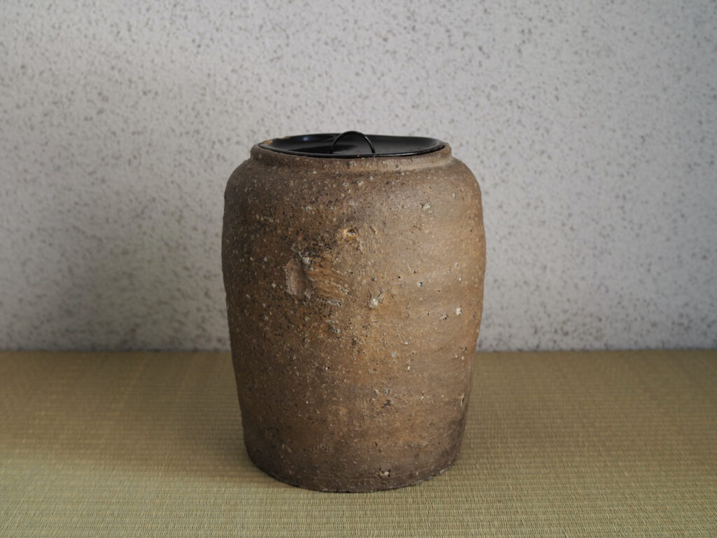 利休信楽と呼ばれる時代の細身の水指で、肩付きの珍しい口造りが印象的です。主張の少ない