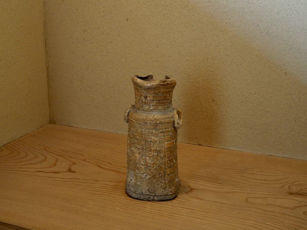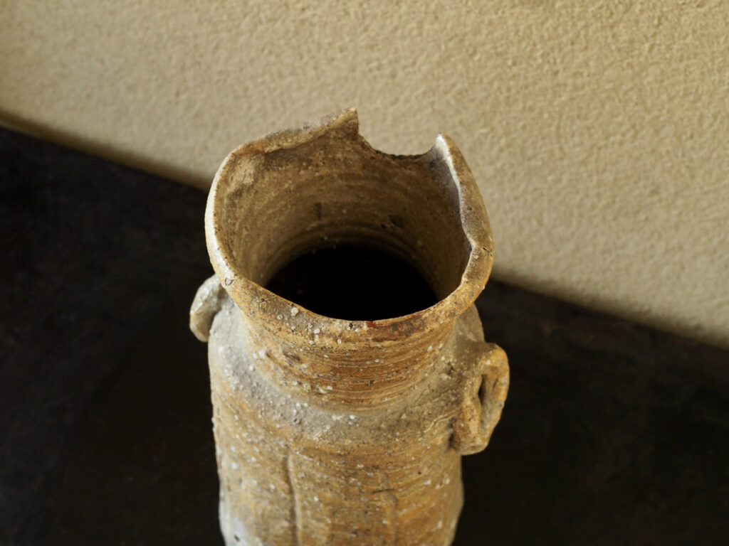 長石釉や鉄釉は施されていませんが、三方向から内へ折込んだ口や、無造作に付けられた環耳