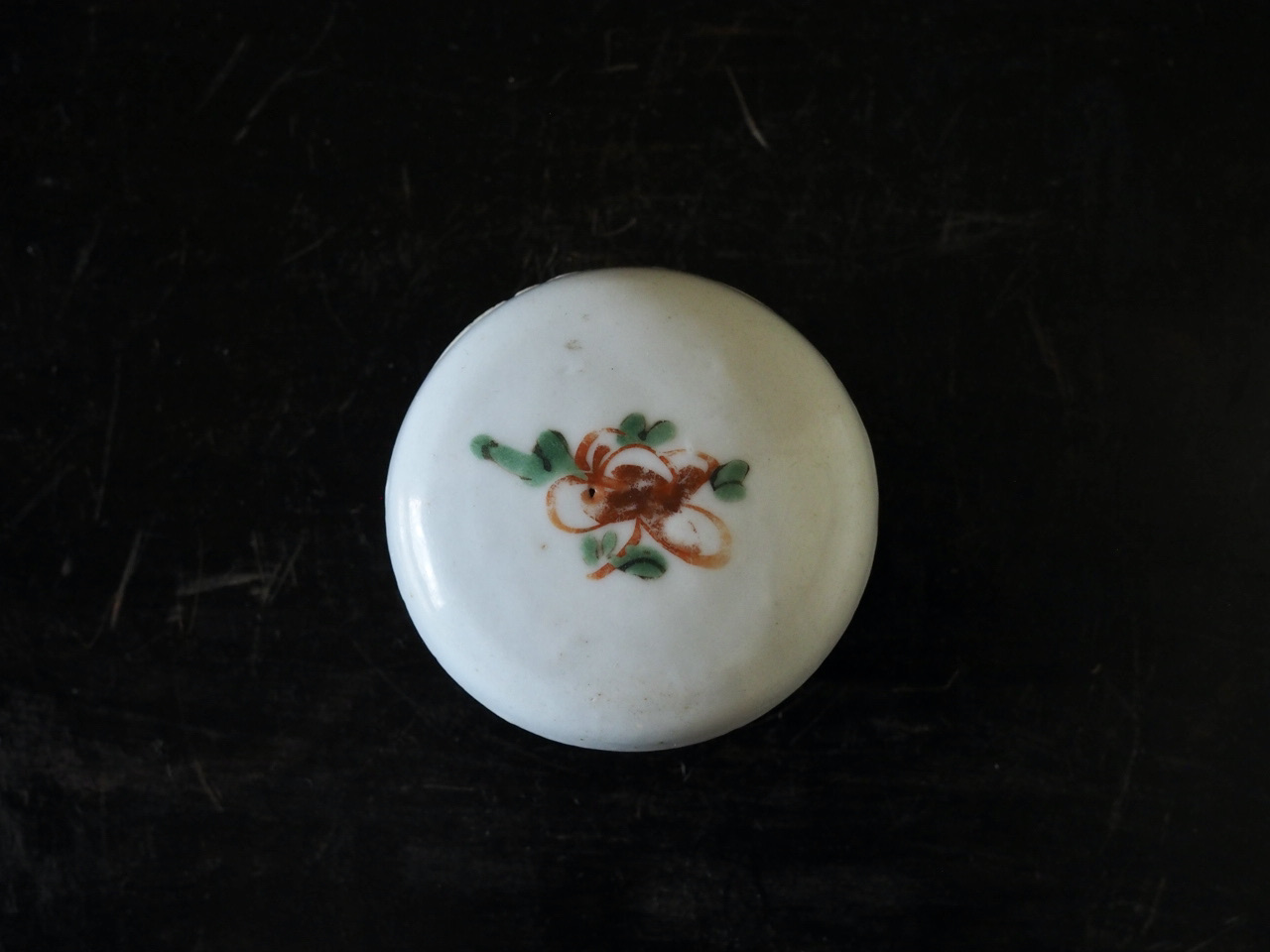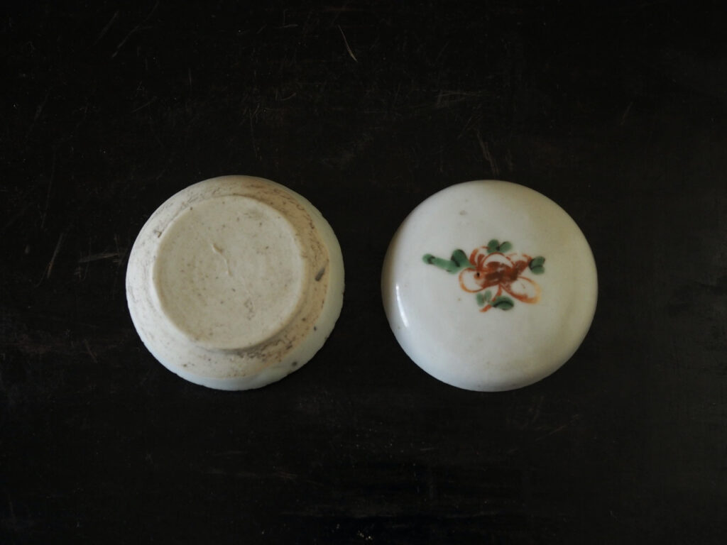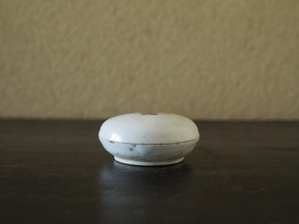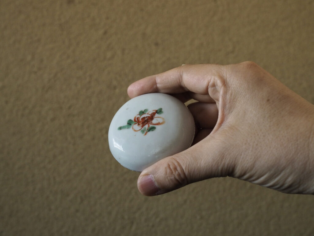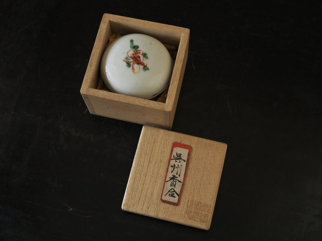 明るく爽やかな磁肌に花文のみが描かれたシンプルで可愛らしい香合です。