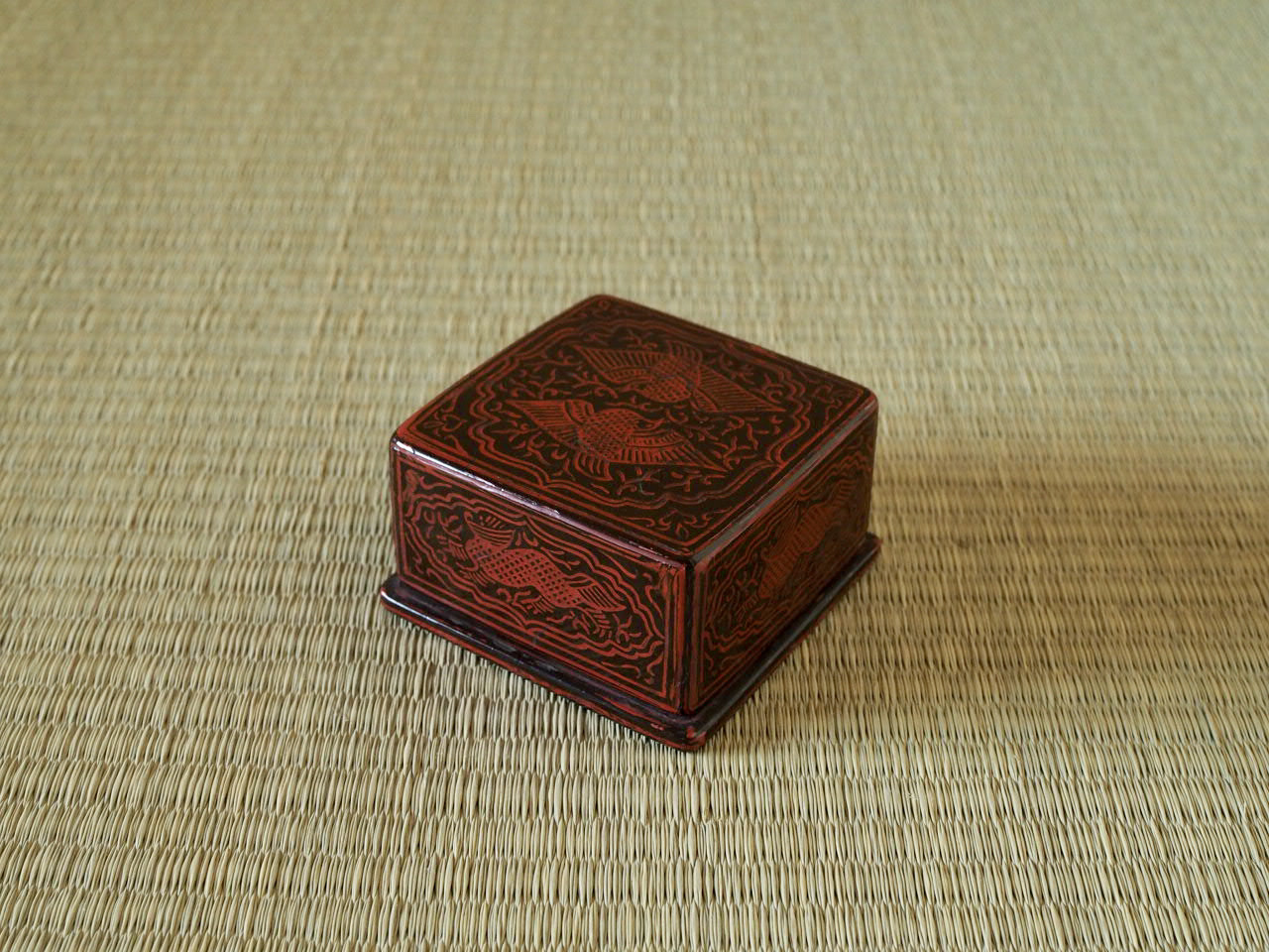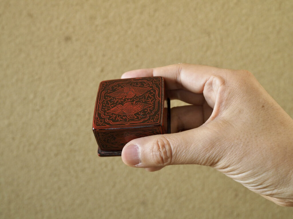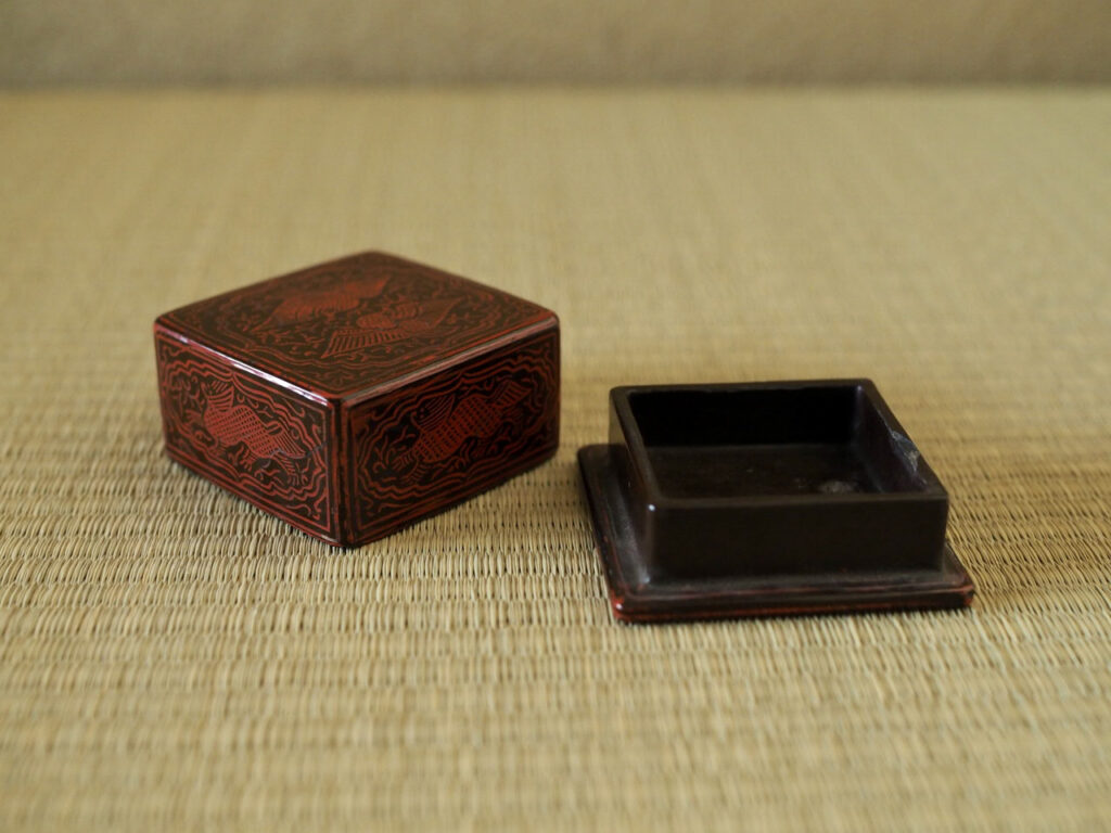 愛らしい正方形の蒟醤の香合です。蓋上と底には瑞鳥、側面には瑞獣がのびやかに描かれ、
