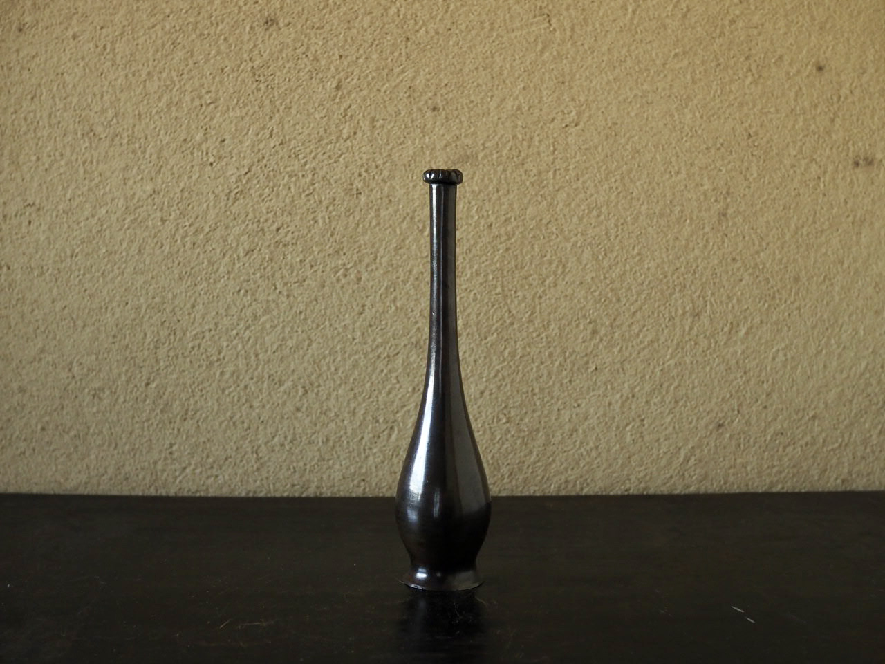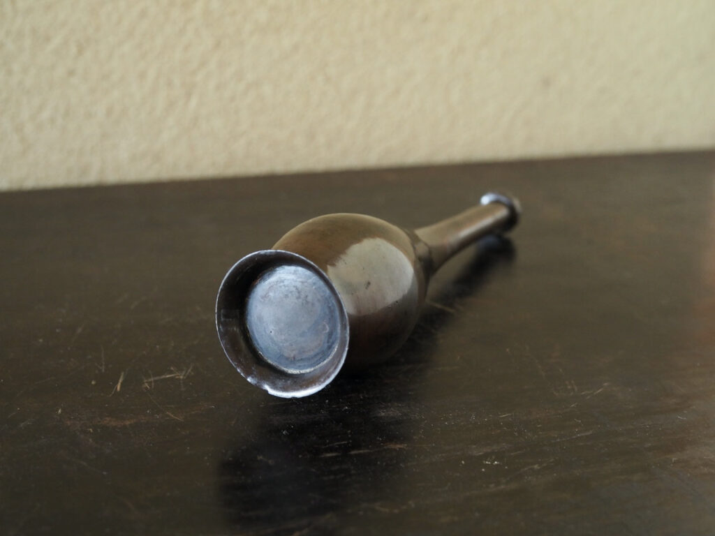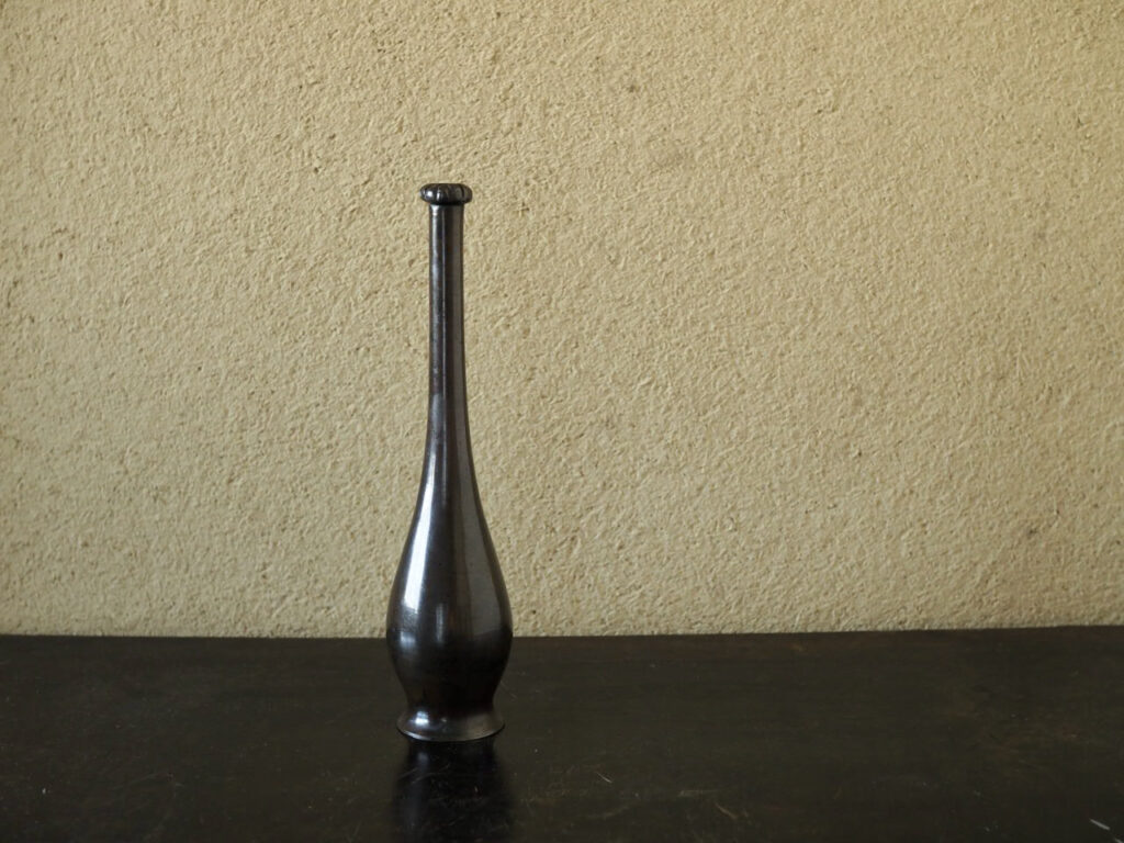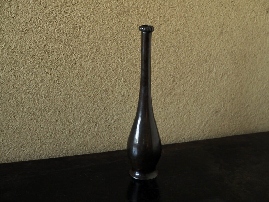 小振りの鶴首花入で小さな柑子口が愛らしいです。古銅ならではのツヤのある肌と