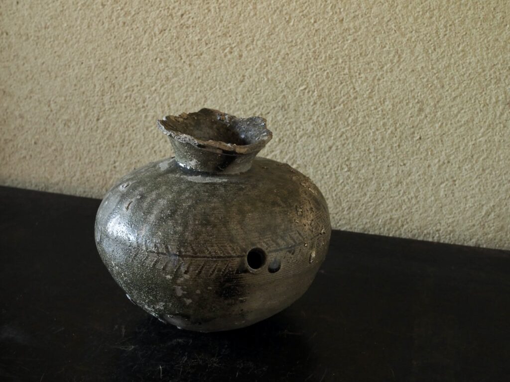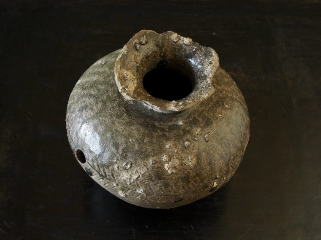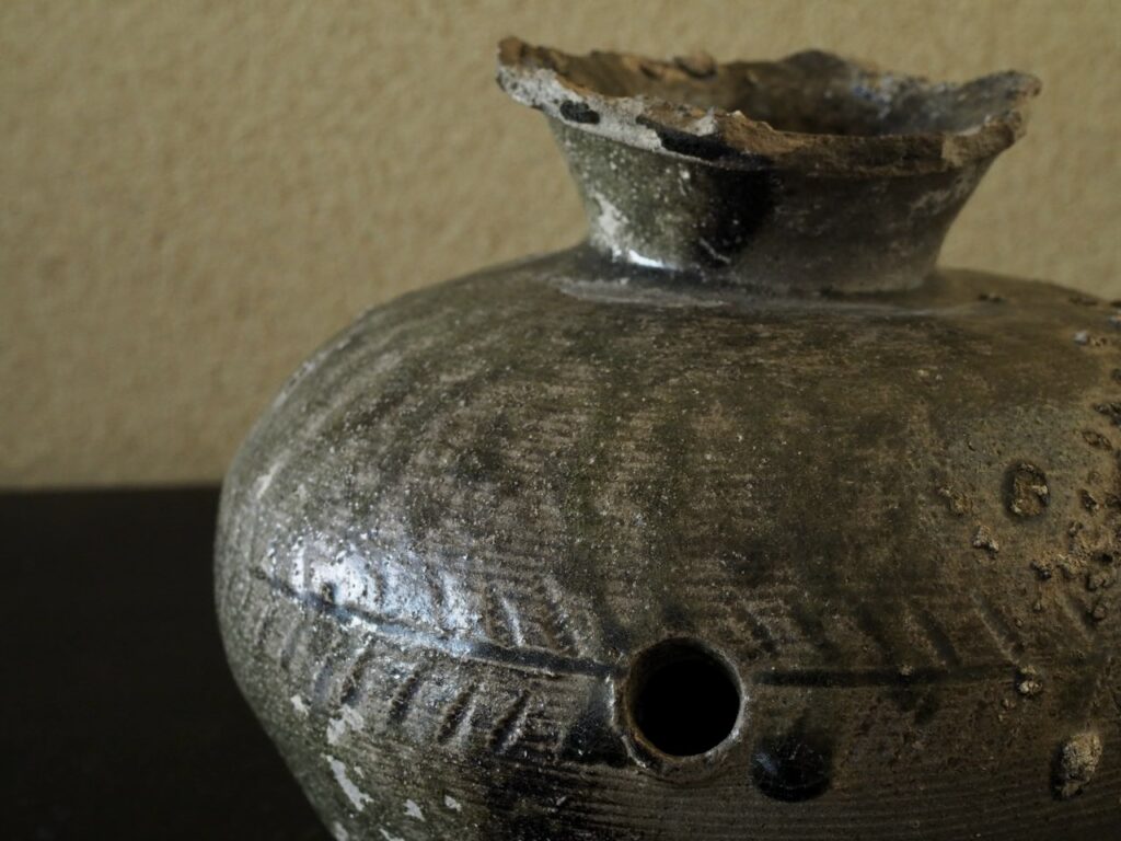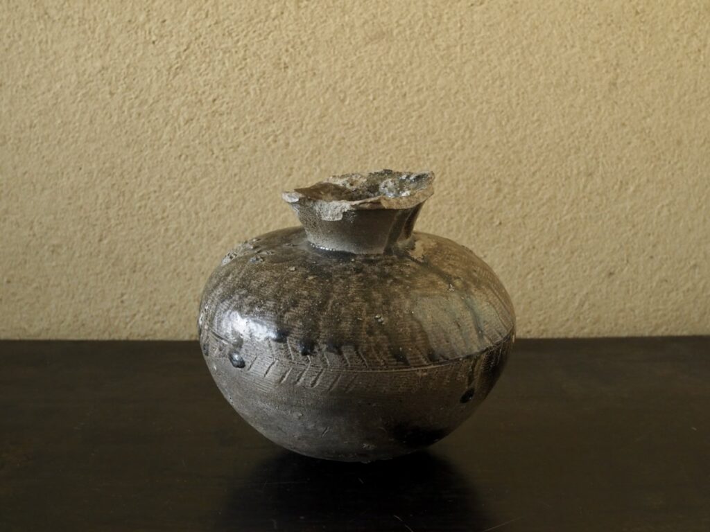 厳しさの中にも、少し傾いだ首が見せる「間」がこの壺の魅力を引き出しているようです。