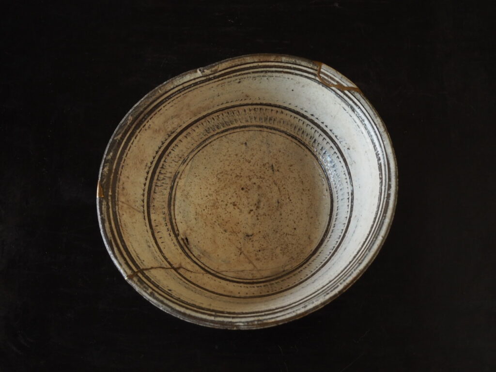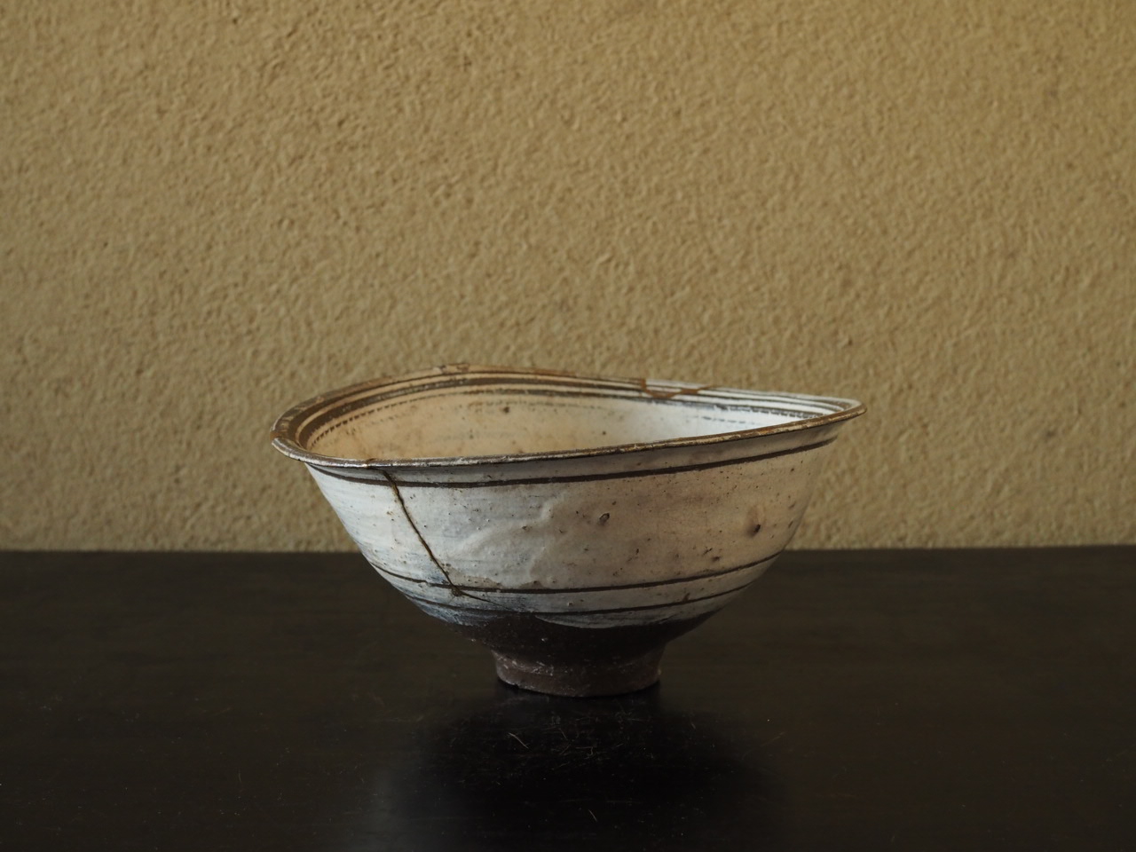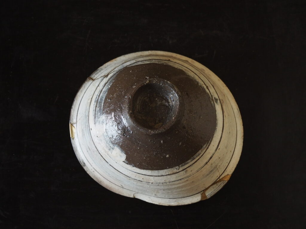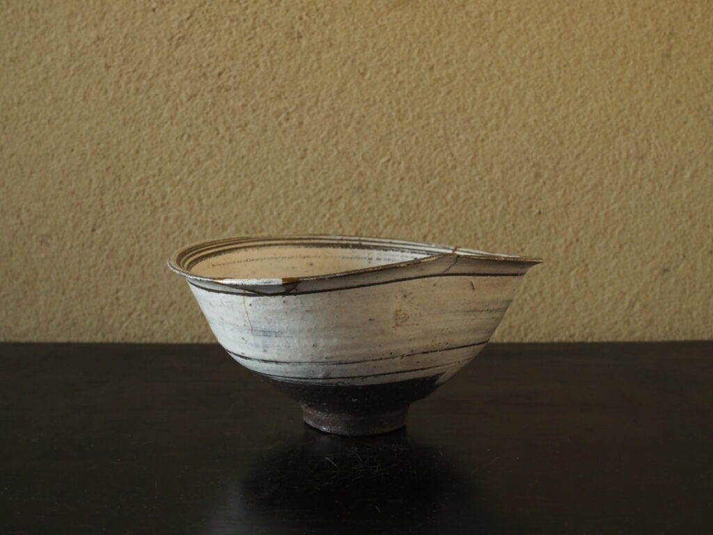 地のチョコレート色と白泥の白のコントラストが大変美しい鶏龍山です。茶碗には少し無理がありそう